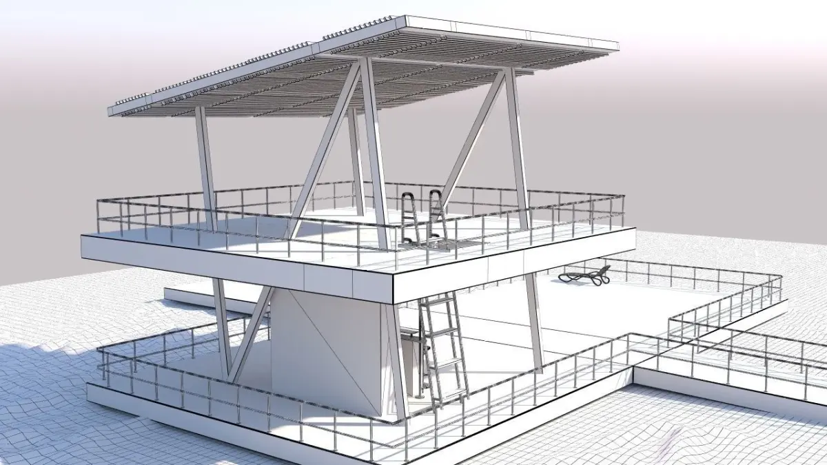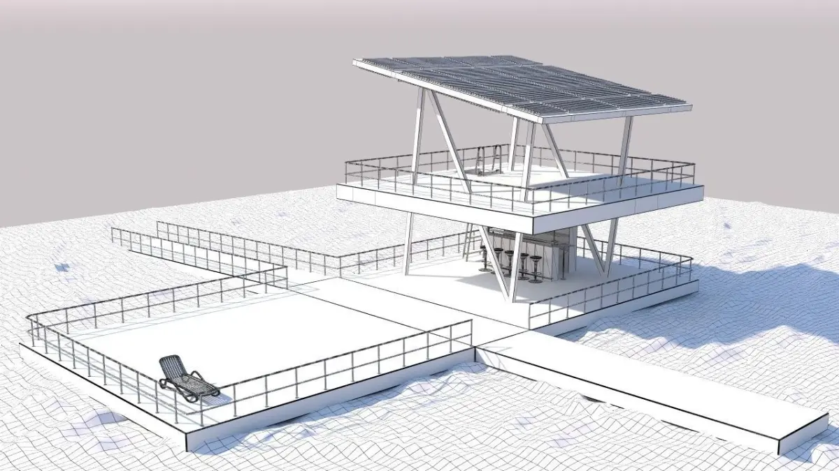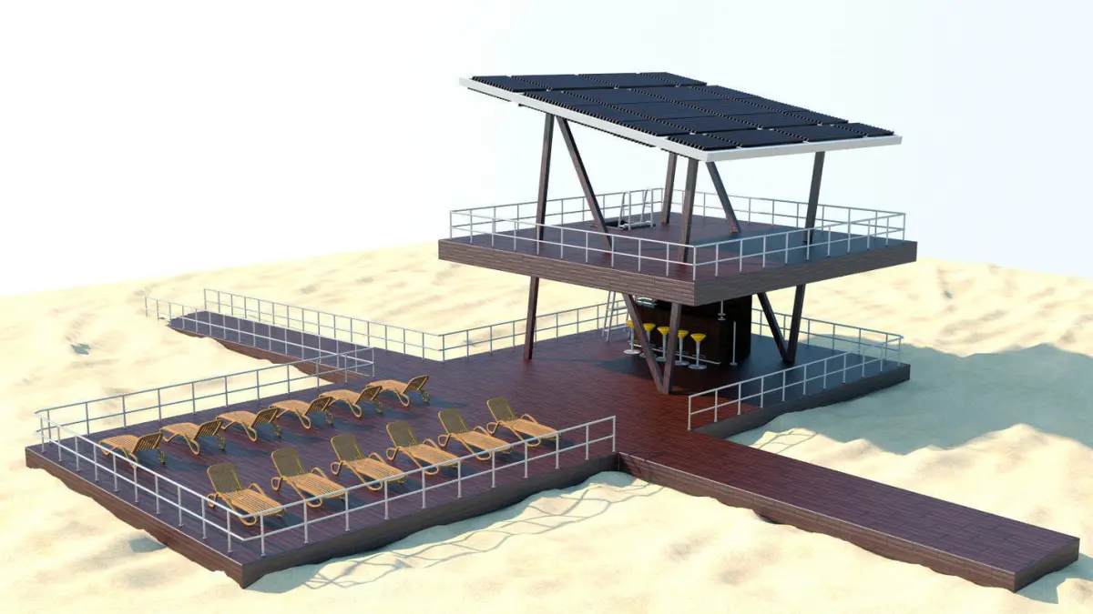 Lifeguard tower and wooden platform with bar.