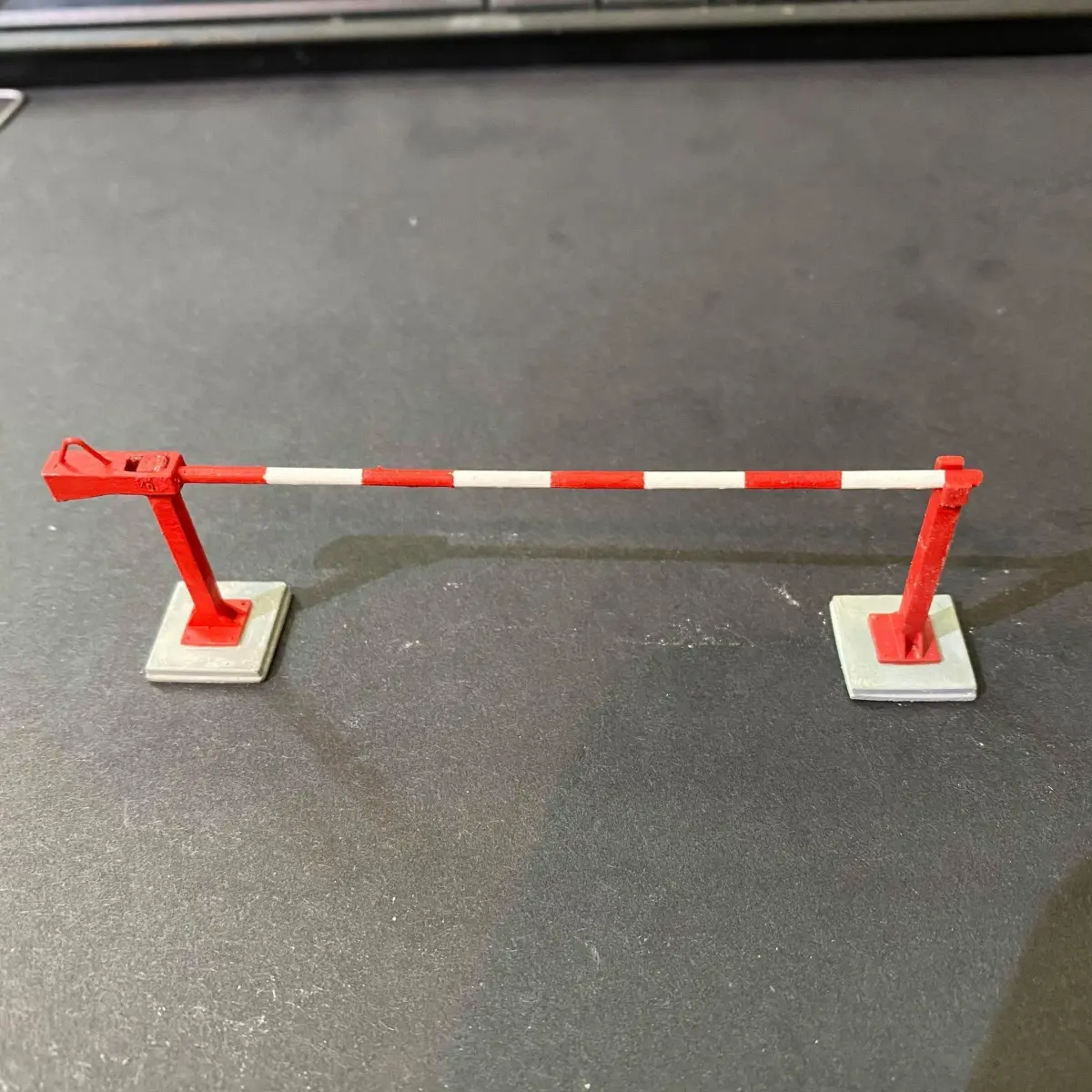 The model is printed as 3 separate parts. Holes are preformed to accept a small piece of wire to act as a pivot pin which allows the barrier to be fully poseable in open or closed positions and anywhere in between. I use 0.8mm copper wire. The barrier is an interference fit over the upright so it stays in position. (It could probably be filed back a little to make a looser fit if you wanted to automate it. I haven't tried - yet!)