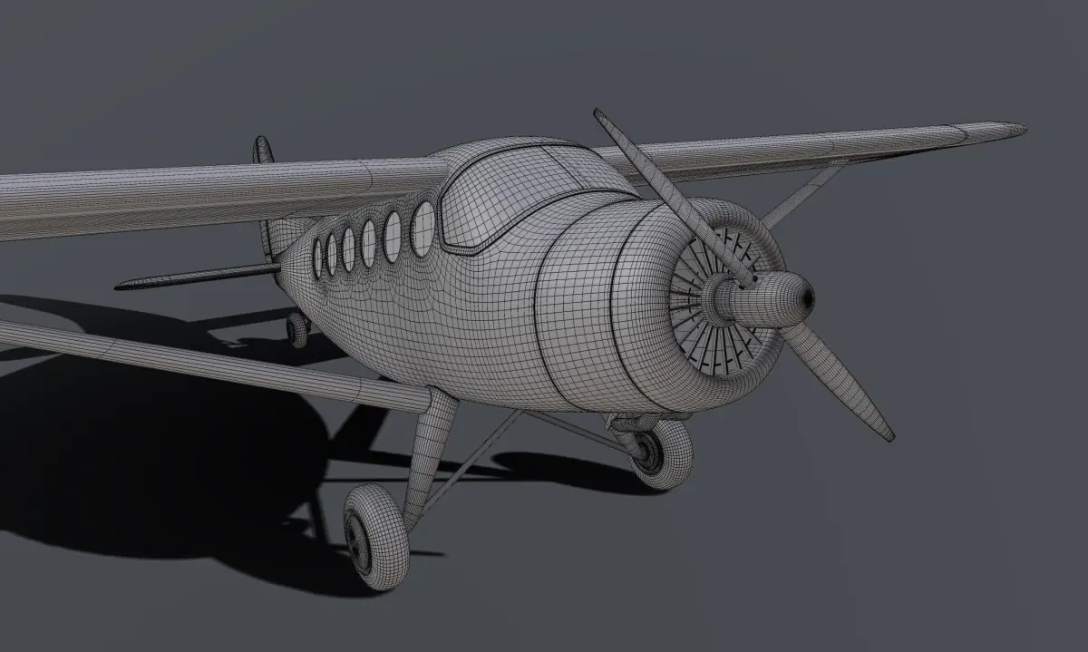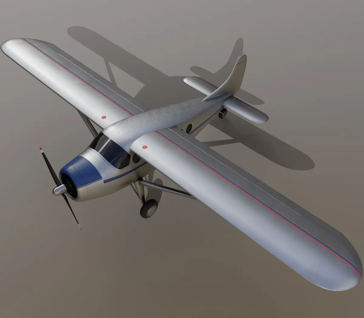 A sleek light aircraft from the historical timeline, designed for civilian use. This aircraft features a rounded fuselage in a shiny silver color, with large windows along the sides. The wings are narrow and elongated, painted in a classic sky blue hue. The propeller at the front spins gracefully, while the tail fin stands tall and proud, painted in a contrasting red shade.