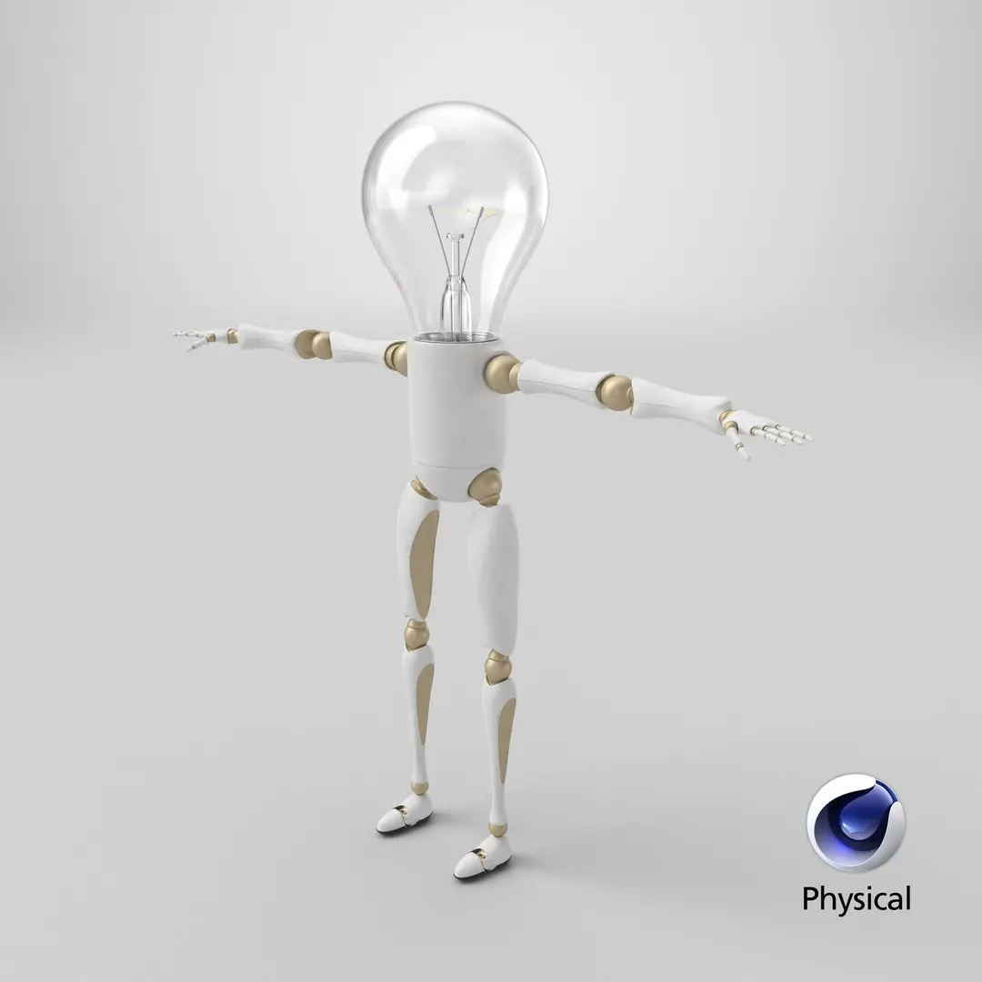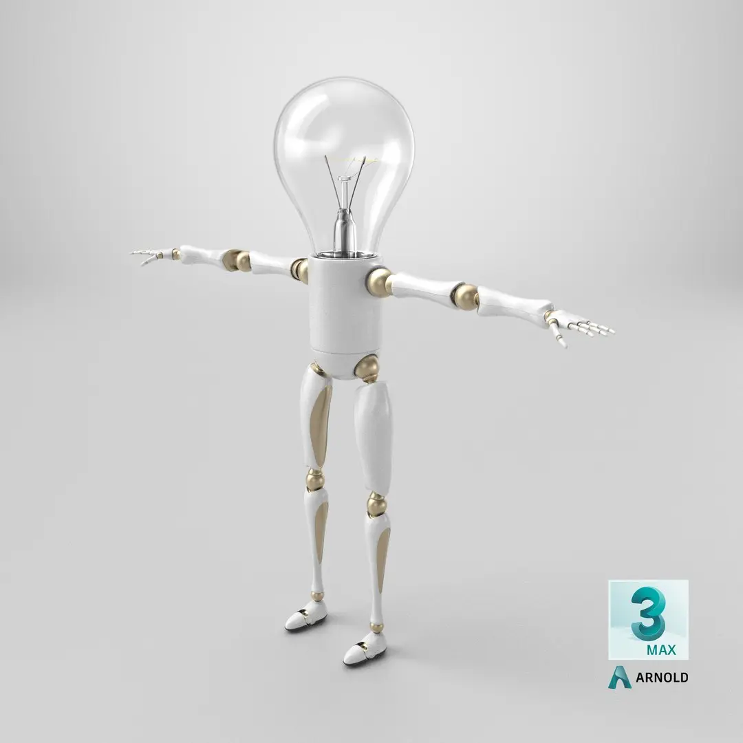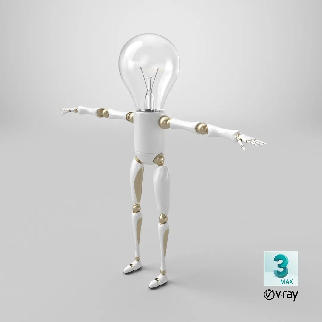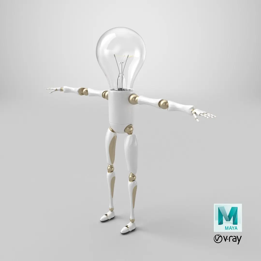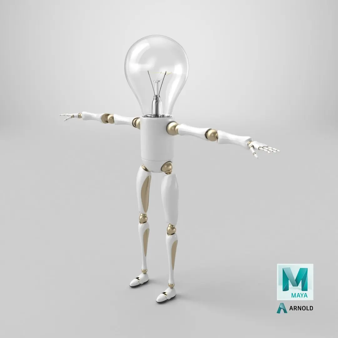 High quality polygonal model of a light bulb character in T-pose. Real world scale in centimeters. The model is composed of 4 separate meshes: the glass of the bulb, others components of the bulb, the metal body of the character and the body covers. The meshes are optimized and fully textured and parented in a useful hierarchy. It is not needed any third-party plug-ins to work with the project. Renders have no post processing.