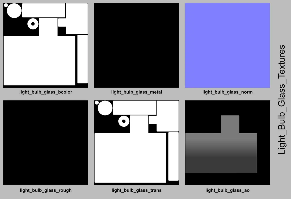 - .png format 4096 x 4096 for the glass of the bulb (ambient occlusion, base color, metal, normal, roughness, transparent)