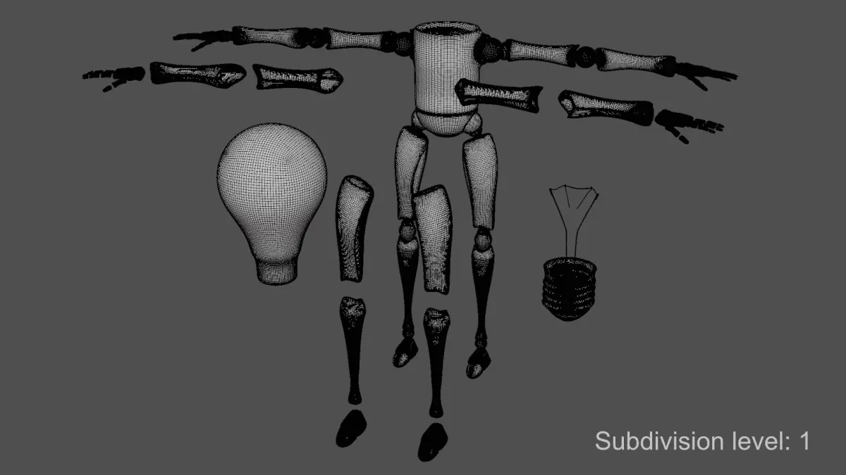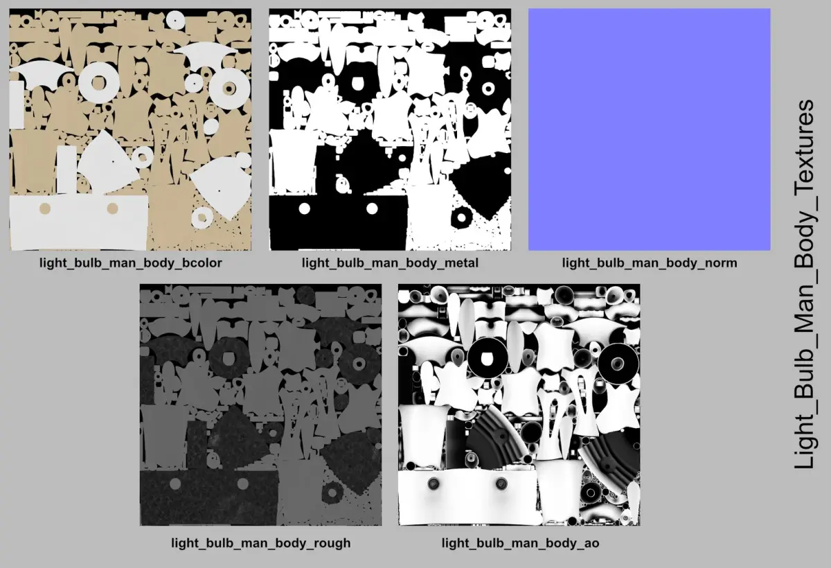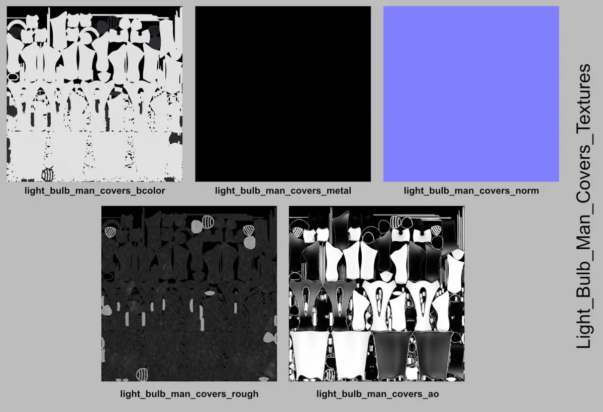 - 4 separate meshes: the glass of the bulb, others components of the bulb, the body of the character and the covers of the body