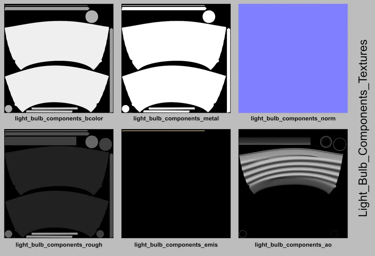- .png format 4096 x 4096 for the others components of the bulb (ambient occlusion, base color, metal, normal, roughness, emission)