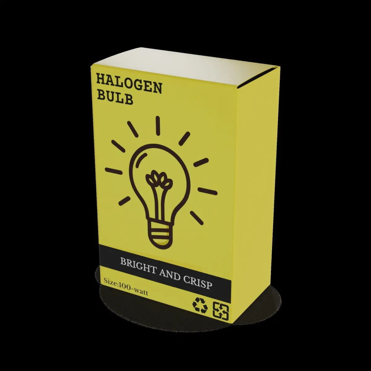 Halogen Light Bulb: This high-performance light bulb is packaged in a sturdy, yellow box. The bulb is protected by a clear, plastic blister pack, ensuring its safety during transportation. The packaging includes a label with the text Bright and crisp and a graphic of a light bulb with rays, indicating its powerful illumination. Size: 100-watt equivalent.