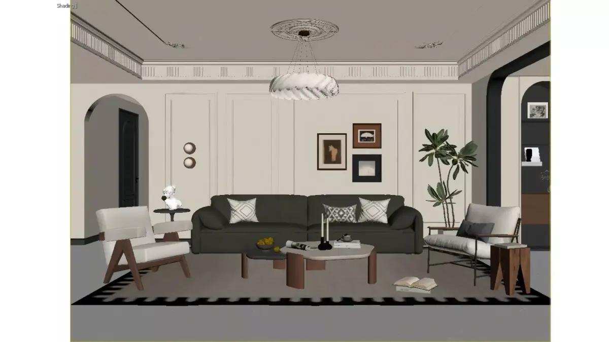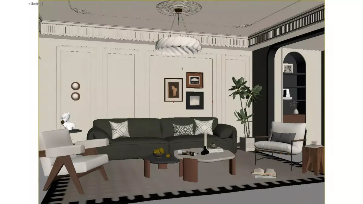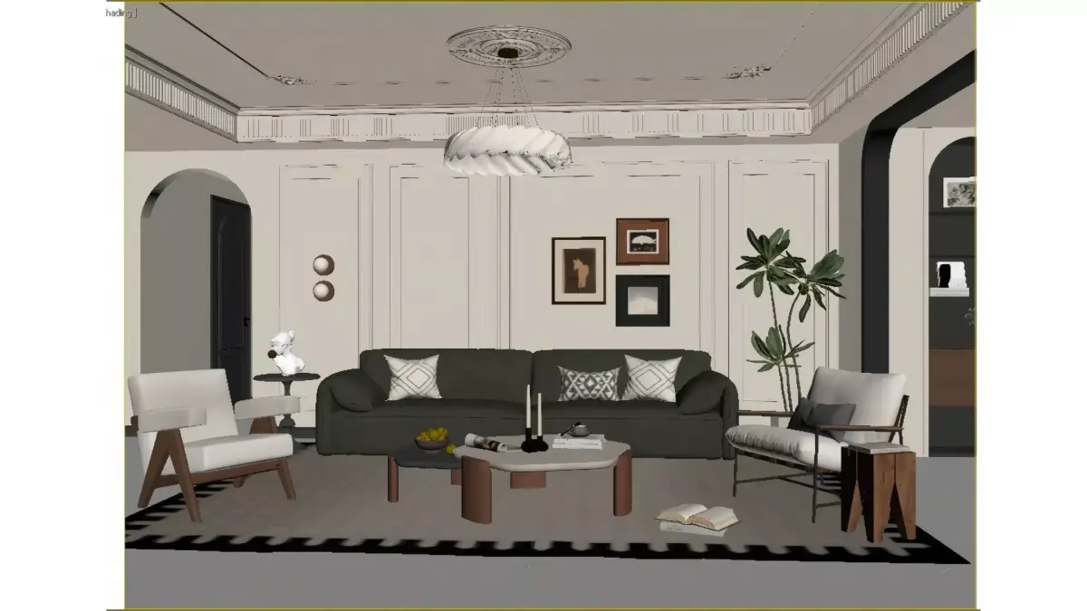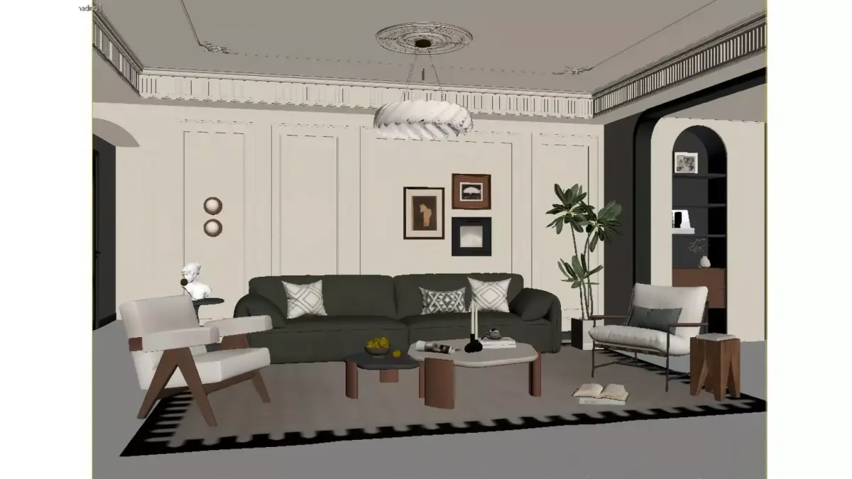 This is a living room blending soft French style with modern retro design, featuring a creamy white base tone that exudes subtle warmth. The plaster mouldings on the walls and exquisite carved ceiling outline an elegant French romantic vibe. A dark emerald green leather sofa brings a retro texture of its own, paired with a sleek mid-century modern accent chair, striking a perfect balance between minimalism and understated luxury. Adding to the charm are a light and airy cloud chandelier, artistic wall paintings and large green plants, which infuse the space with a gentle ambience and a laid-back living feel. All in all, the entire space delivers a light luxury, comfortable and highly stylish living experience