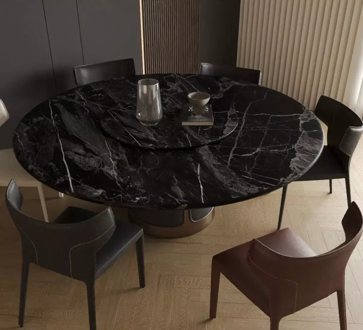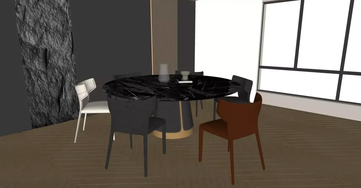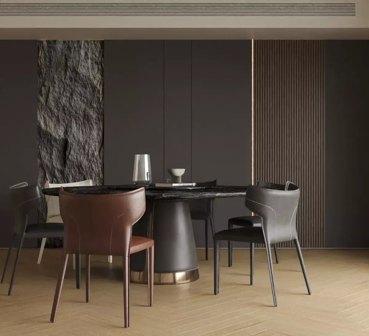 This is a set of light luxury dining table and chairs. The round dining table with black marble texture is matched with a metal - textured base, showing luxurious delicacy. The surrounding dining chairs are designed with leather in different tones, such as dark brown, gray - black and beige, with a simple but stylish shape. The rock - textured decoration on the wall and the vertical strip elements complement each other. The overall space is artistic in light luxury, making it a dining area with both taste and comfort.