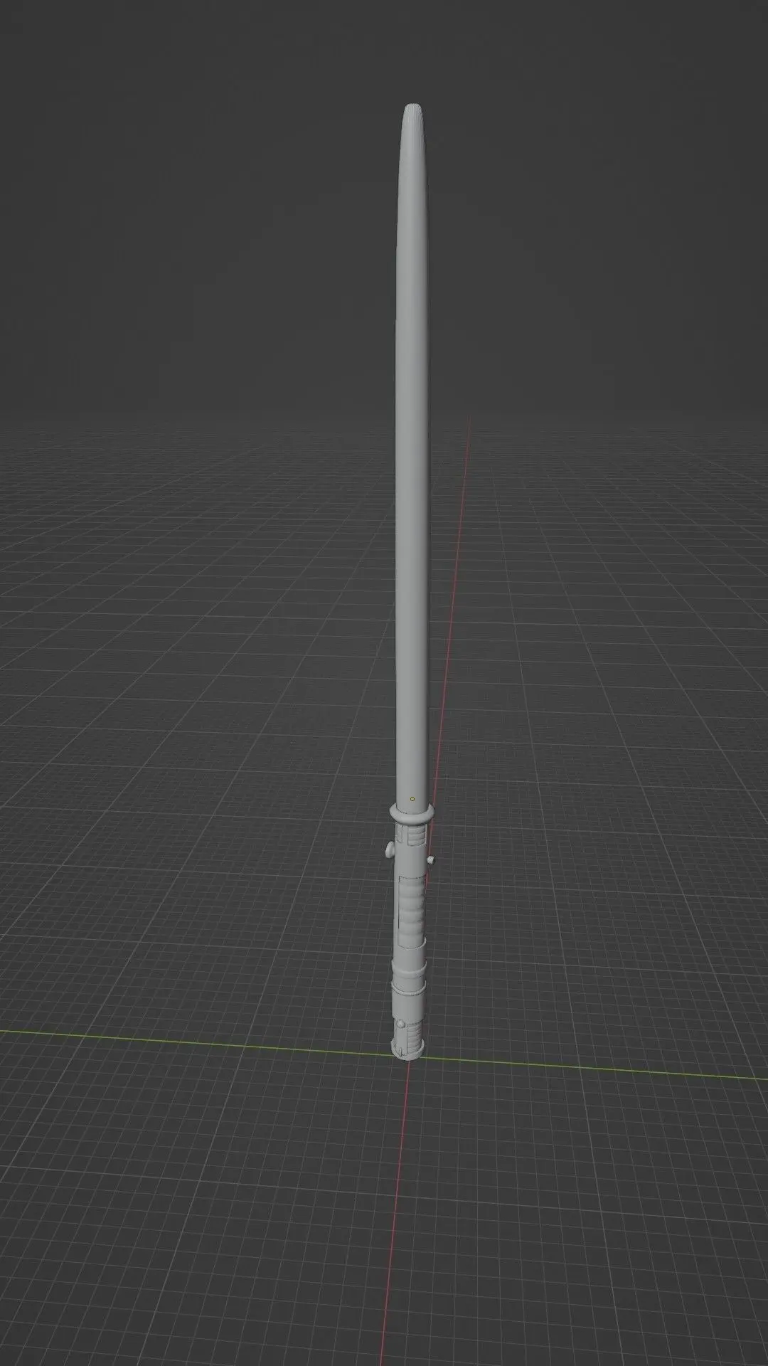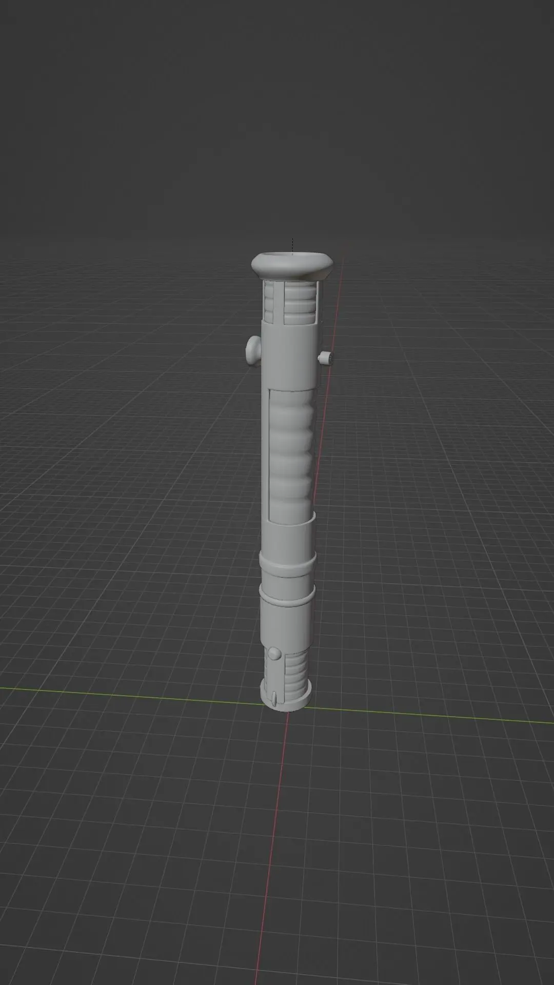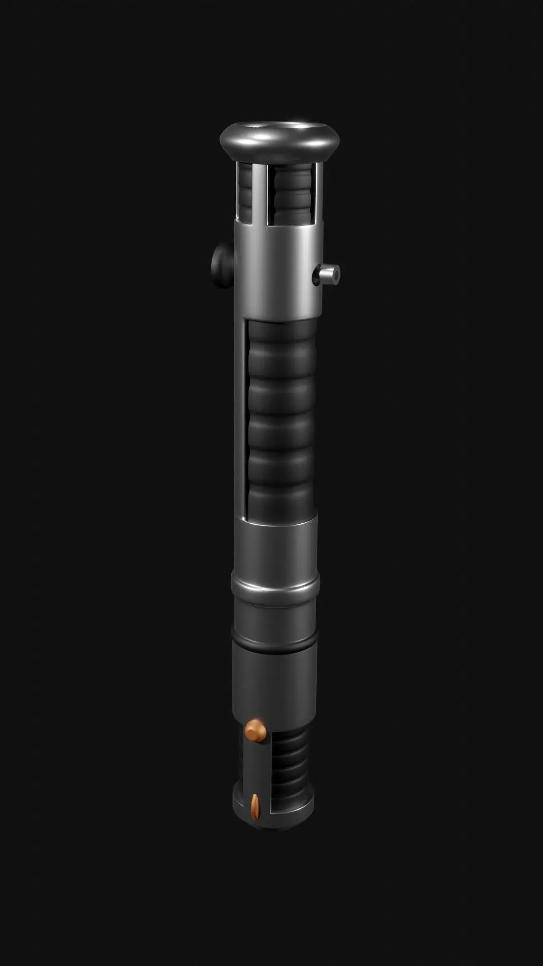 A metallic and rubber lightsaber with some copper details. The lightsaber can still be turned on or off by pressing on the part where the light comes out and then on 'object data properties', if you are on blender off course.