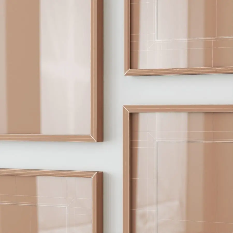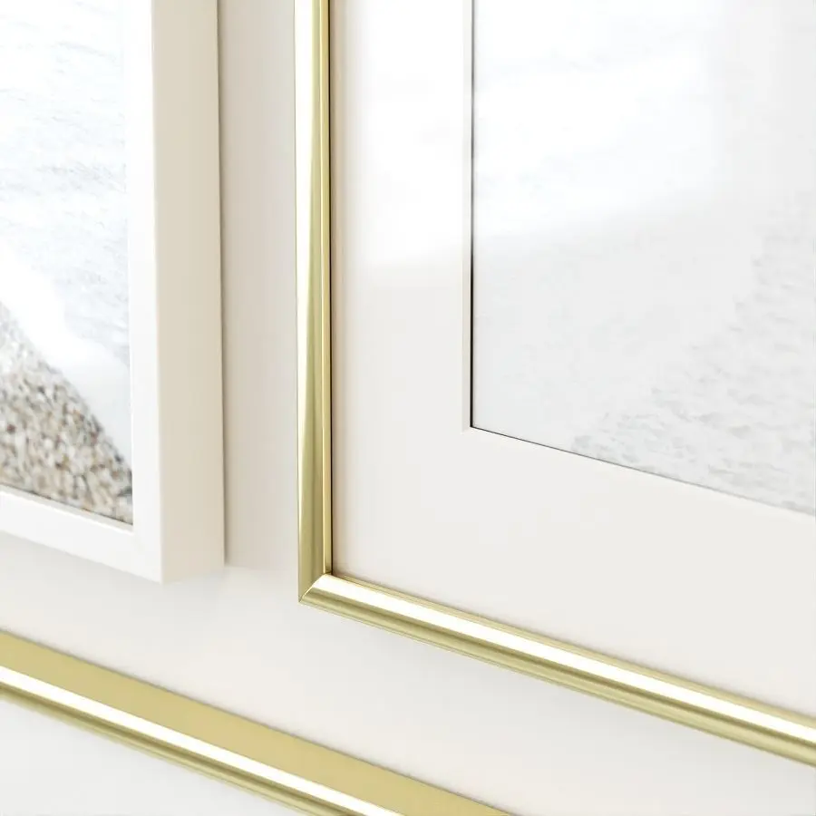 A gallery wall in soft neutral hues in white wooden and gold frames.