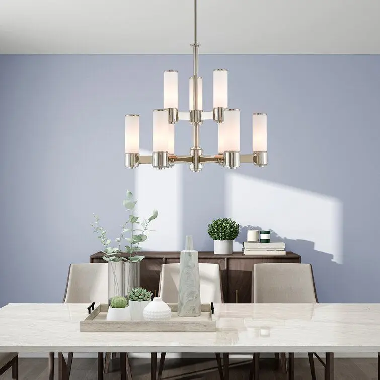- This stunning design features studded with hand-blown satin opal white glass. This sleek design will brighten up entryways, living spaces, and dining areas.