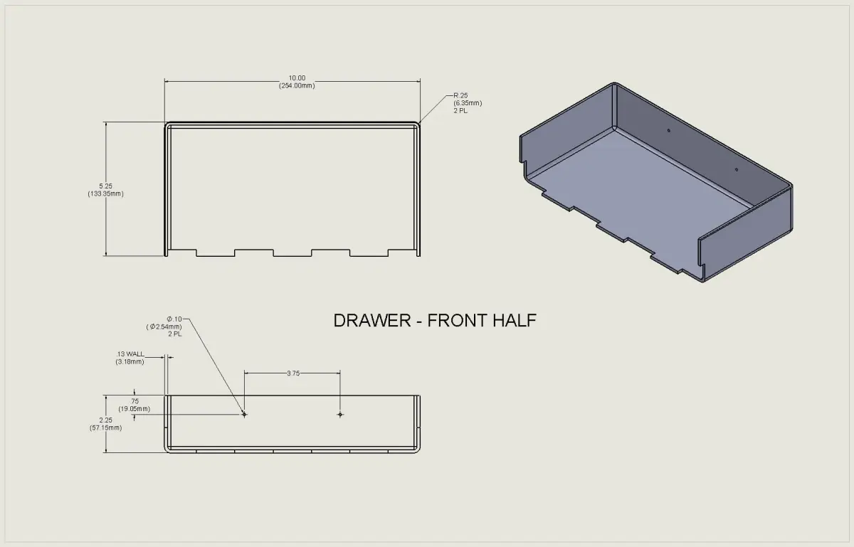 Finished drawer measures 10in x 10in x 2.25 Tall (254mm x 254mm x 57.15mm Tall)