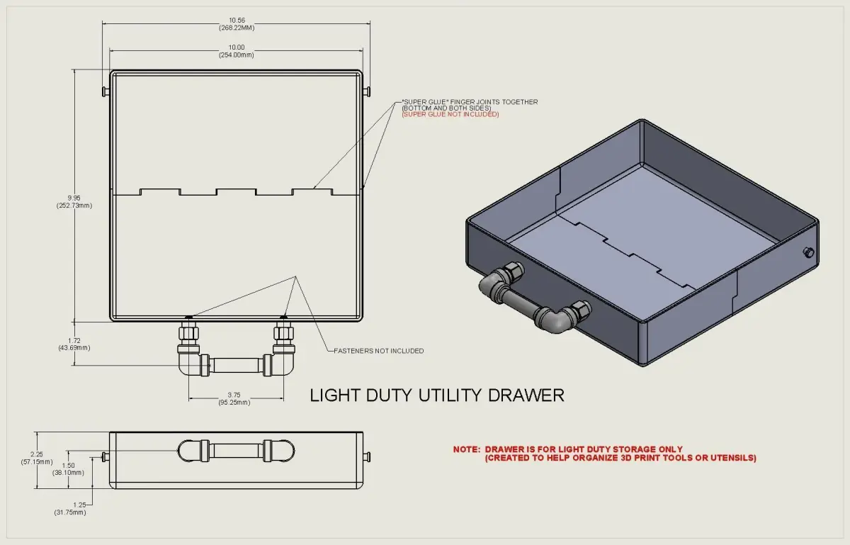 Designed a drawer to organize my 3D printing utensils or tools. It is light duty, but seems to be holding up great, for my needs.