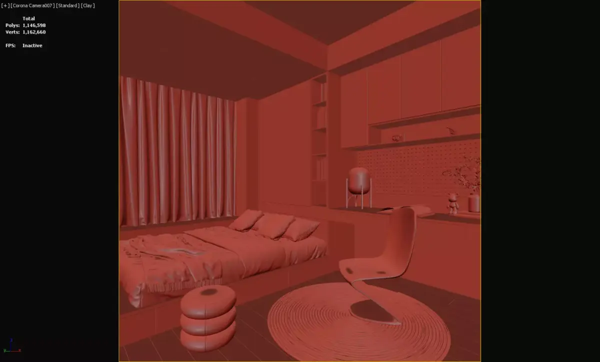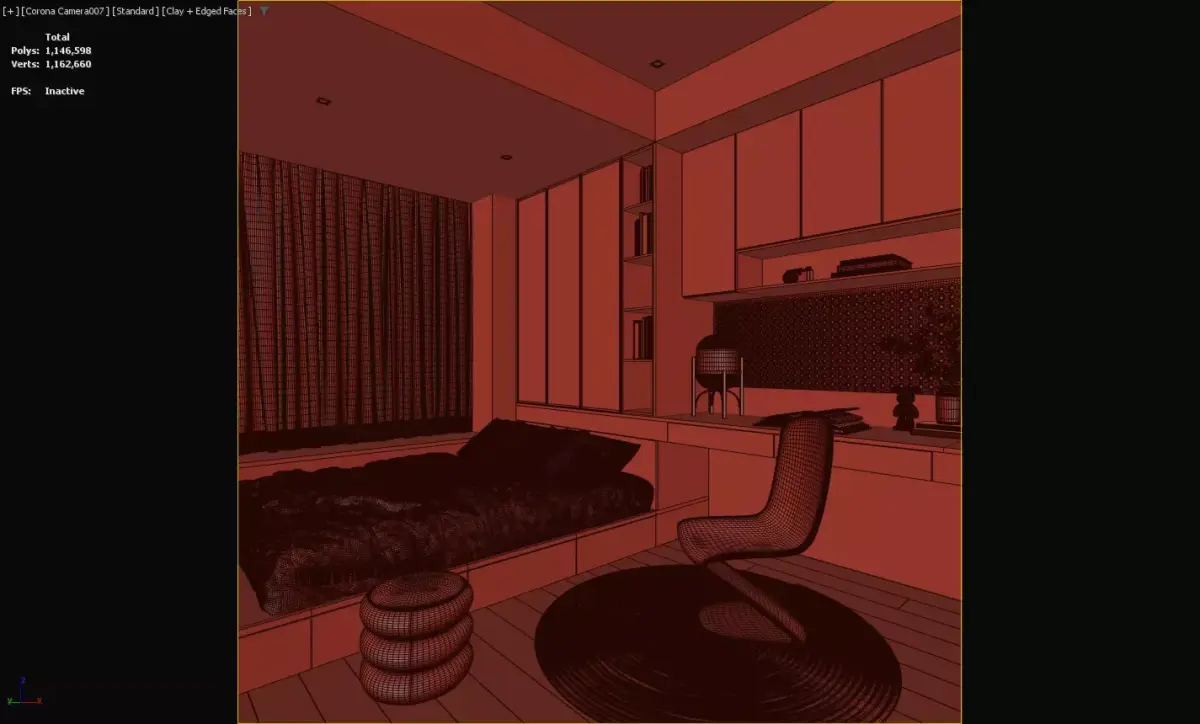 This 3D model presents a light wood-themed compact bedroom integrated with a study area, featuring:Built-in elements: Floating bed (with under-storage), seamless desk + cabinetry, and open shelving (for books/decor).Design details: Perforated accent wall, ambient lighting, and a translucent acrylic chair—balancing minimalist light wood aesthetics with functional small-space layout.Optimized for interior renderings and small-space virtual staging, it suits urban apartments, merging sleep, work, and storage in a bright, cohesive modern design.