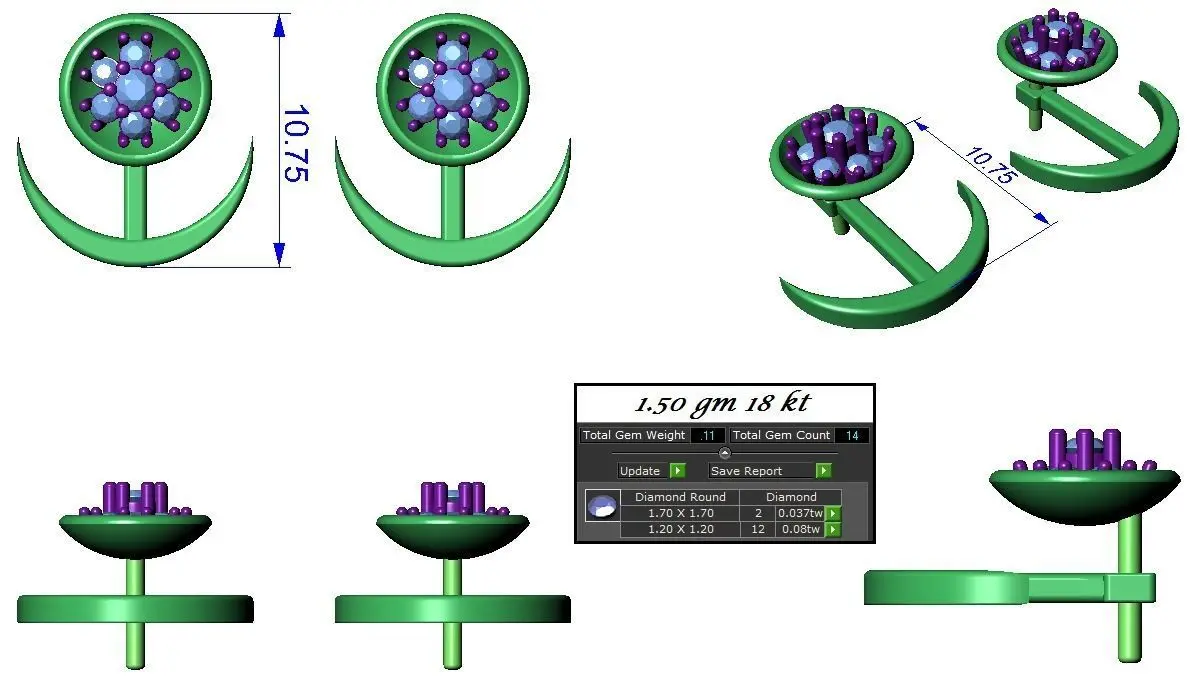 Light wt Women Diamond Earrings renders 3dm stl and details