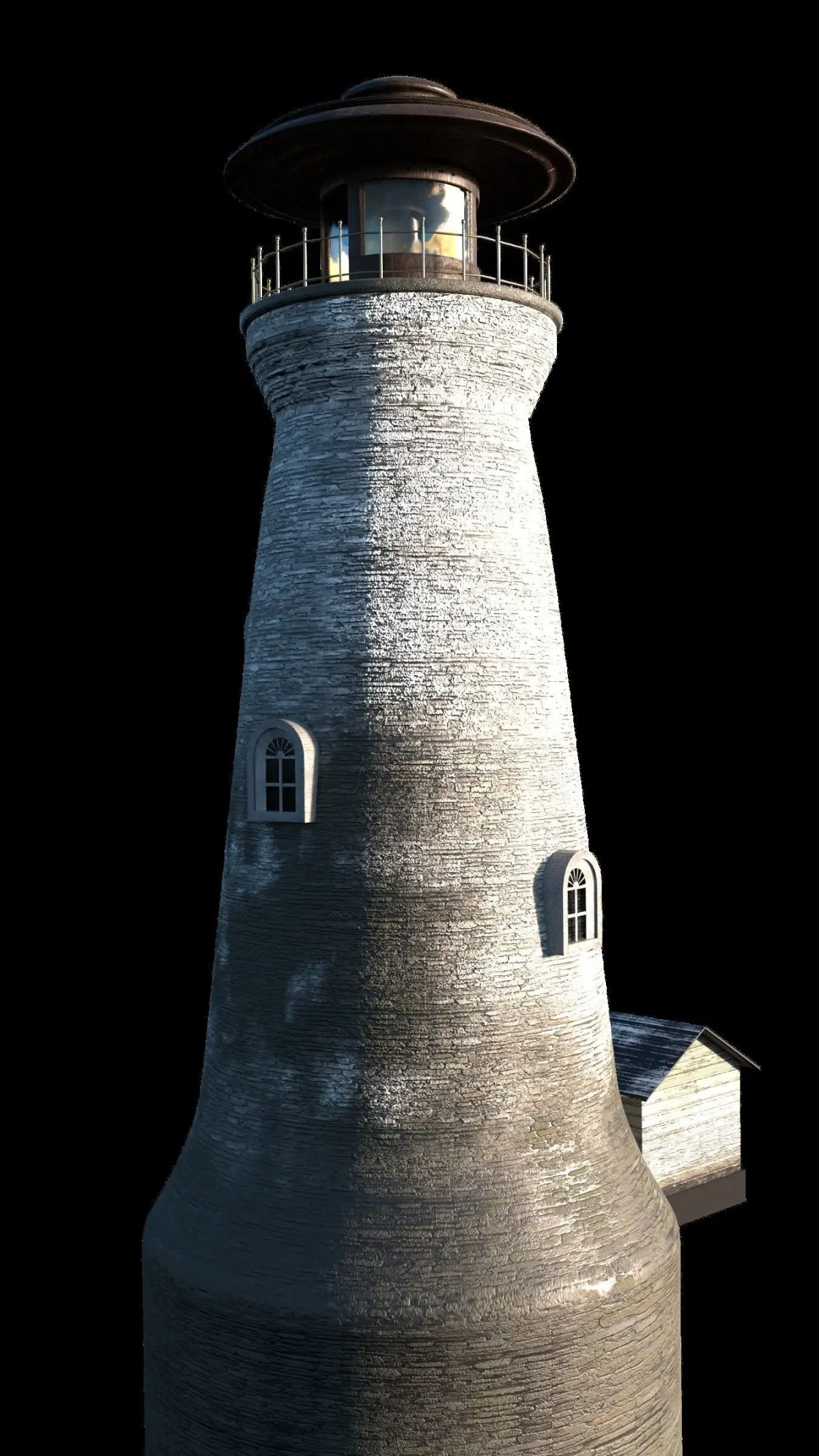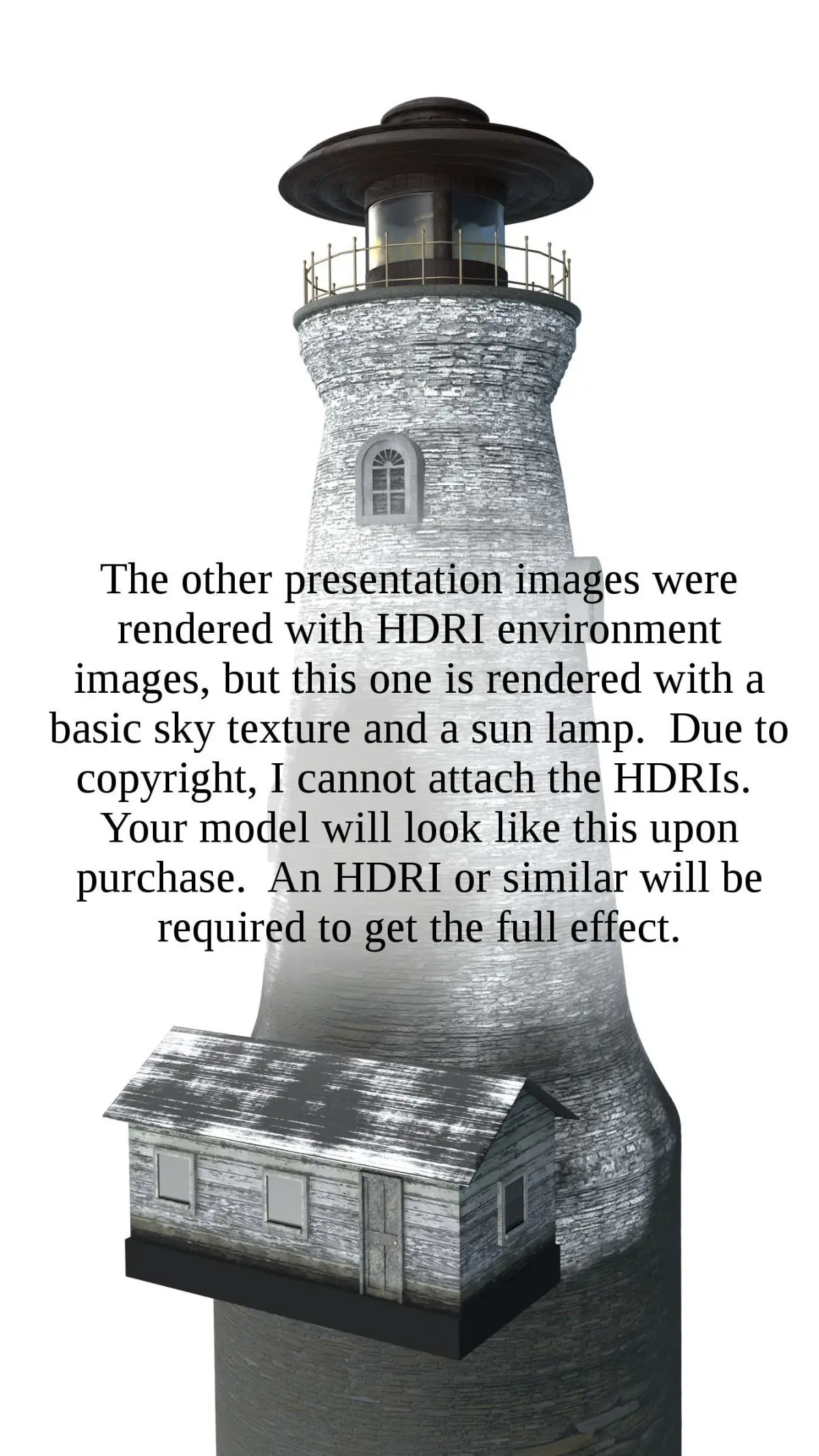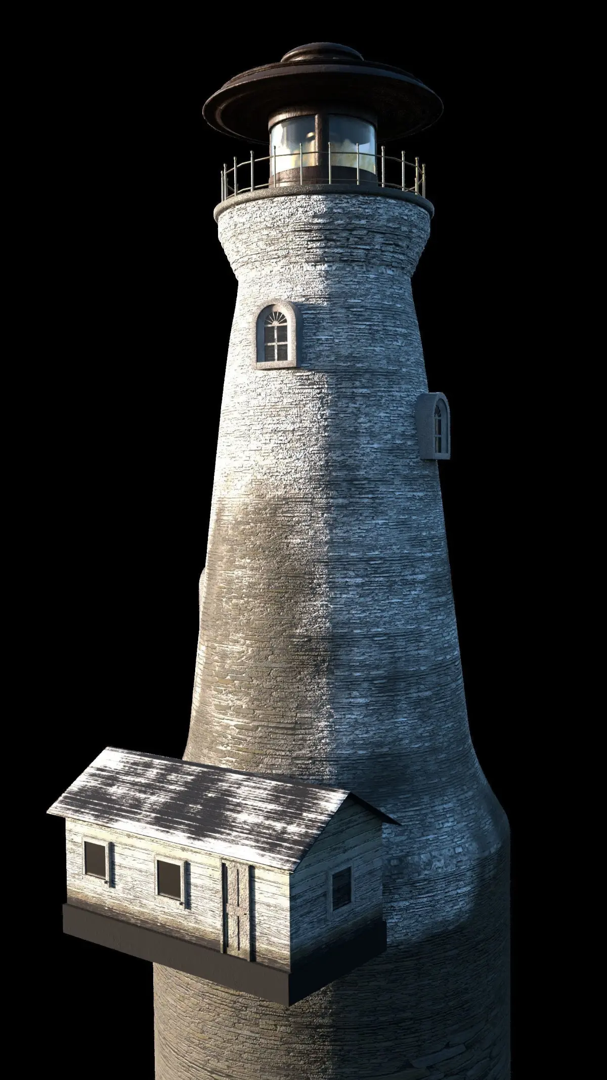 A model of an old, weather-worn lighthouse that will retain its quality from about 30 feet away and further (To give an idea of scale, the lighthouse diameter is 30 feet). Distances of about 15 feet or less may require additional texture work. To see the complete example scene, follow this link: https://www.artstation.com/artwork/163KL