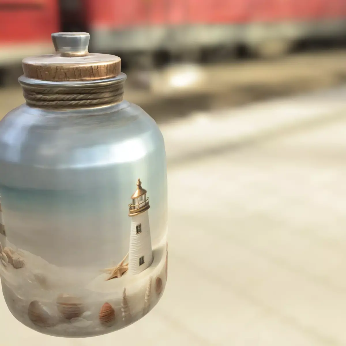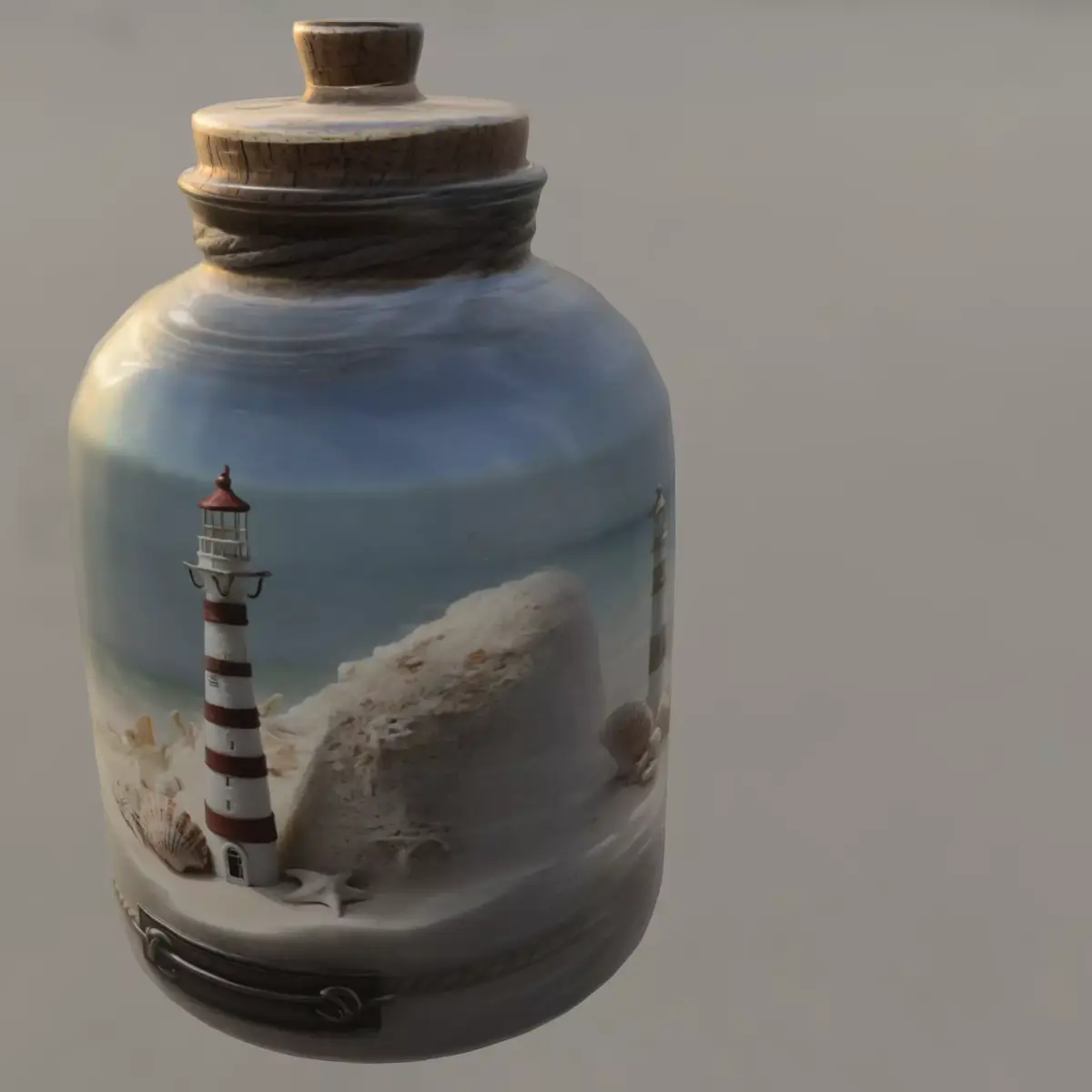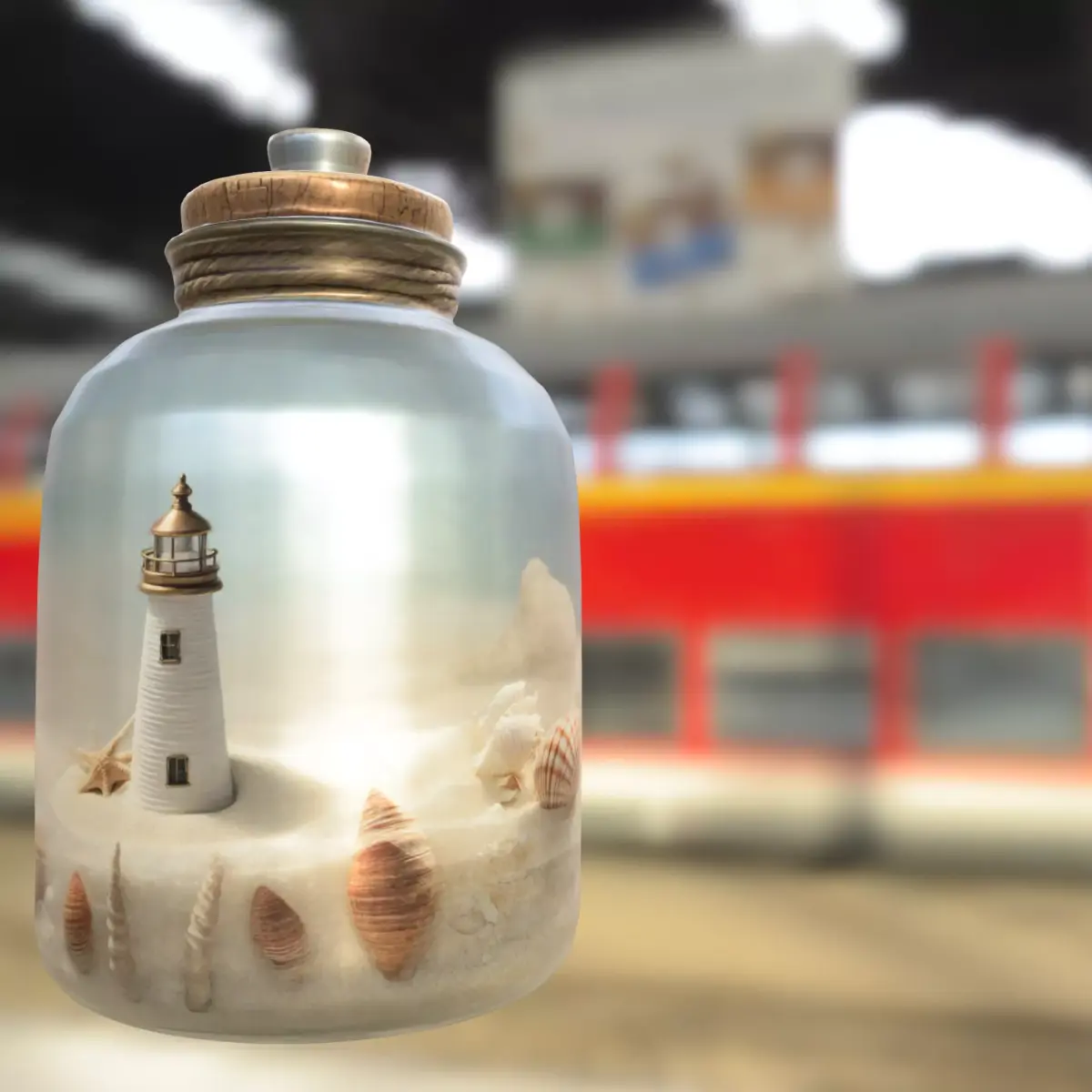 This high-quality 3D model presents a red-and-white striped lighthouse enclosed in a clear glass jar, resting on a sandy beach scene adorned with seashells and rope detailing. Designed for game development, this asset can be used in popular game engines like Unity, Unreal Engine, and Godot as an environment prop, collectible item, or decorative element in simulation, exploration, or storytelling games. The model is also fully prepared for 3D printing, making it perfect for physical display or creative collections. Available in OBJ, FBX, STL, DAE, PLY, GLB, and native Blender formats.
