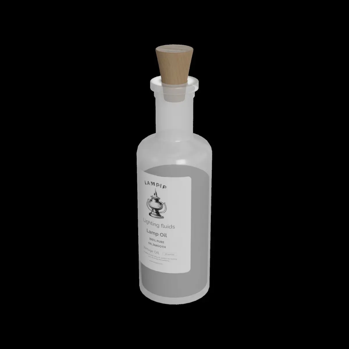 Lamp Oil: A bottle of clear lamp oil, perfect for fueling your oil lamps and lanterns. The oil is contained in a transparent glass bottle, allowing you to easily monitor the remaining quantity. The packaging includes a label with the text Lamp Oil in elegant, cursive font, accompanied by a graphic of a traditional oil lamp. The bottle holds 16 ounces of oil, providing ample supply for extended periods of illumination.