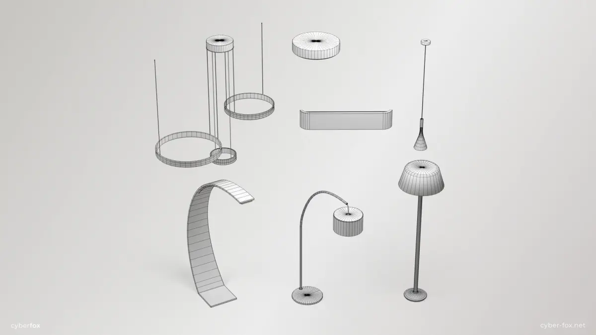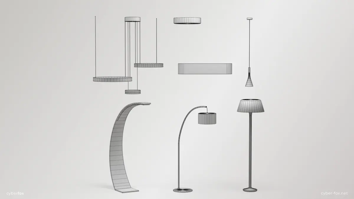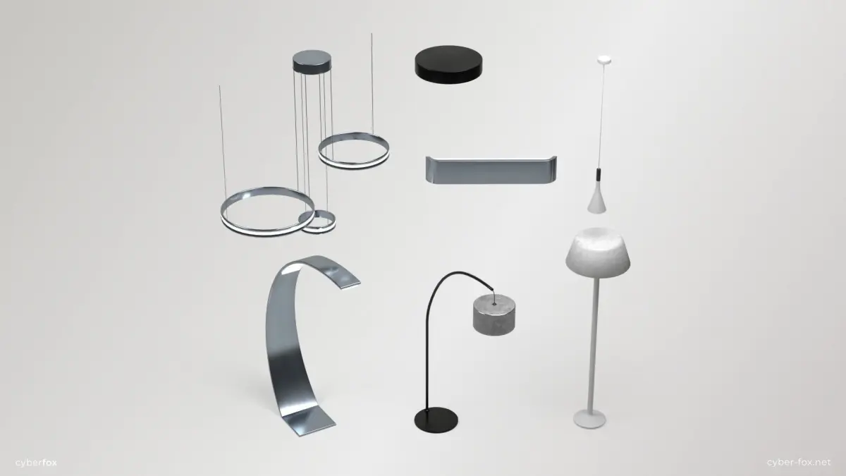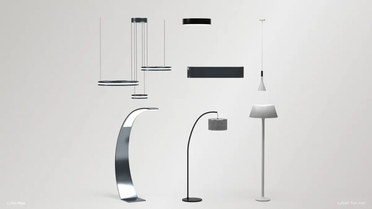 The set includes 13 lamps of different shapes and sizes: floor lamps, table lamps, ceiling lamps, wall lamps