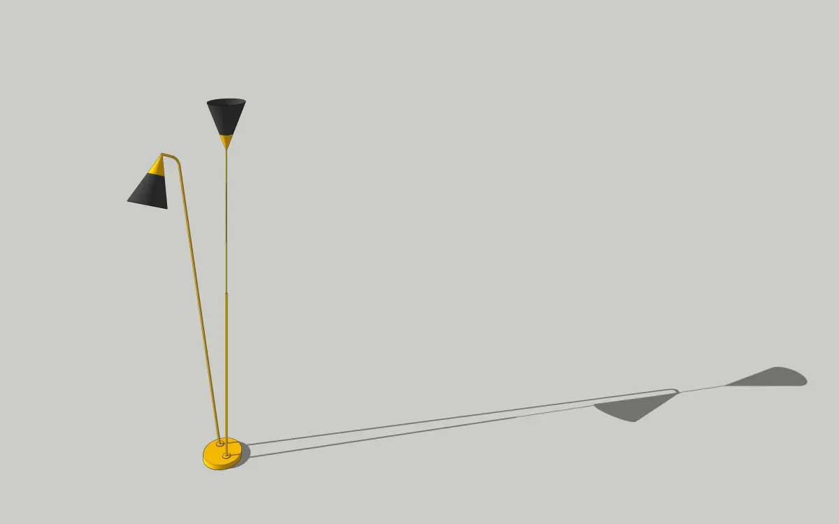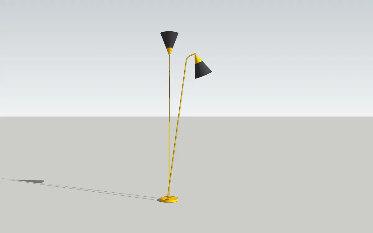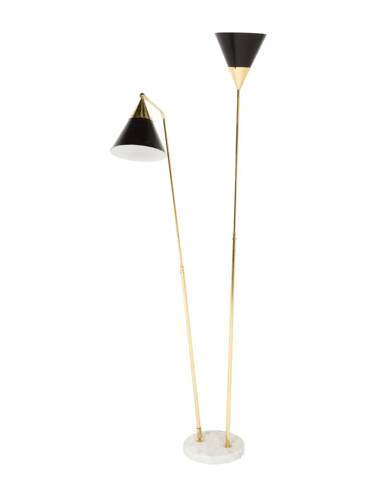 DescriptionGold-tone Stilnovo double floor lamp with two adjustable conical shades and marble base. Tested for working order.