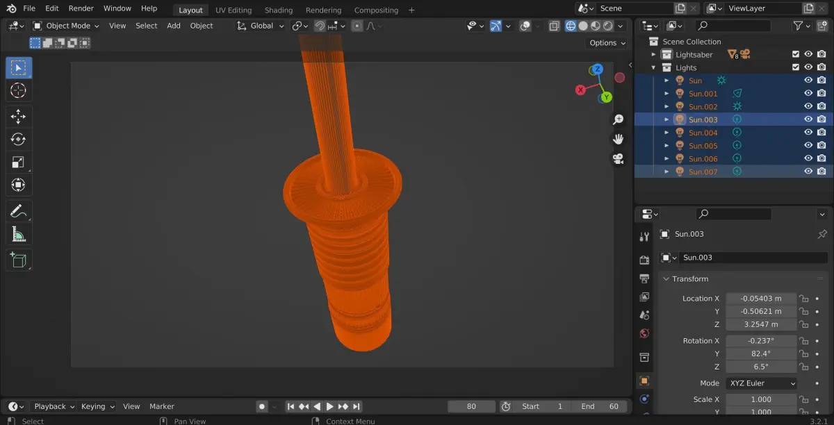 The 3D model ( Lightsaber ) is separated by 8 layers, I recommend not to merge all the 3D model because it could collapse Blender.