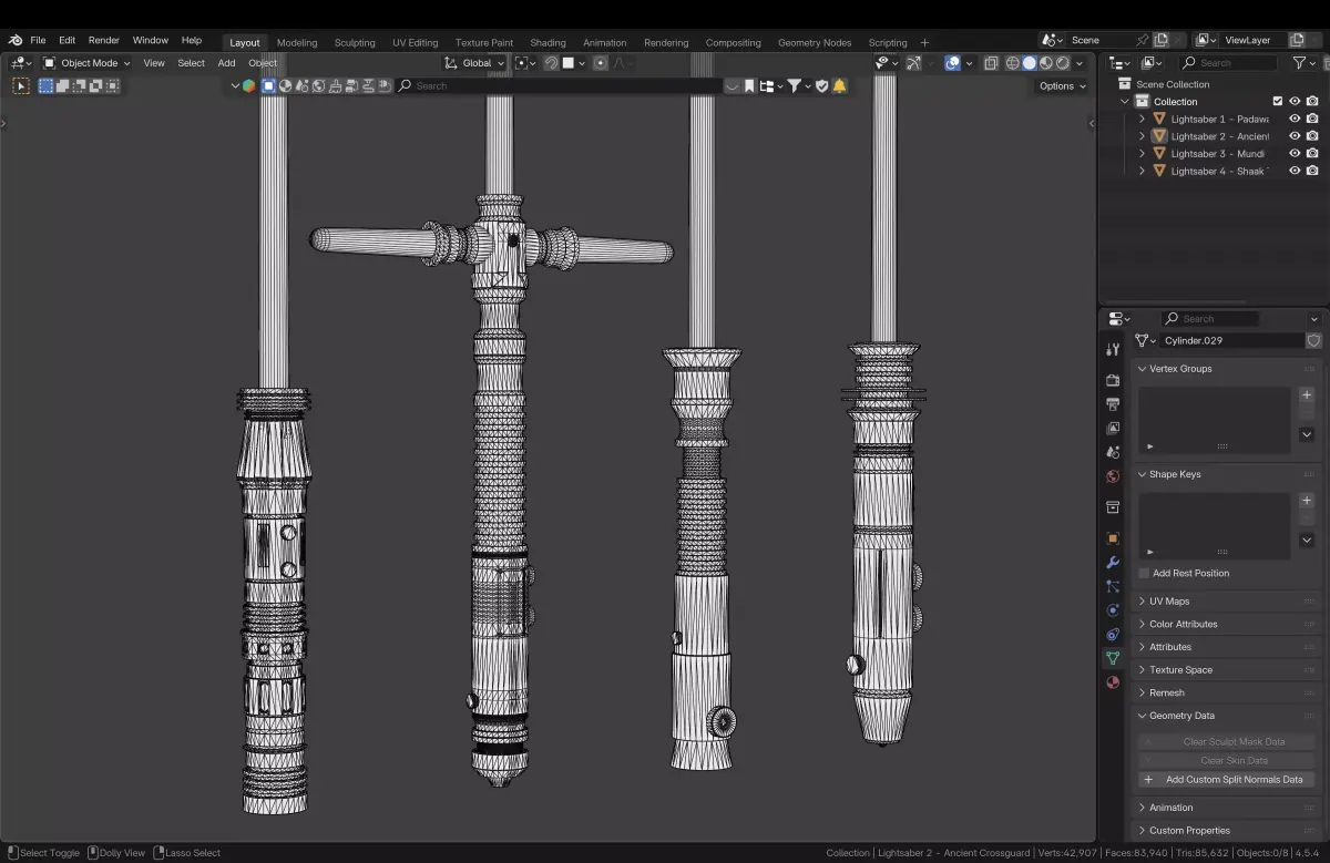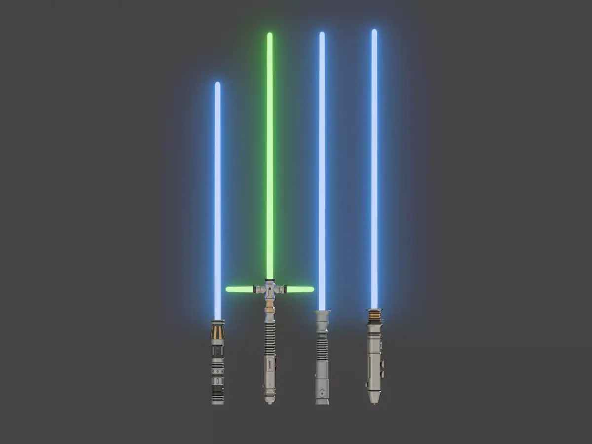Each lightsaber has a 4k textures set and a blade mesh with emissive material.