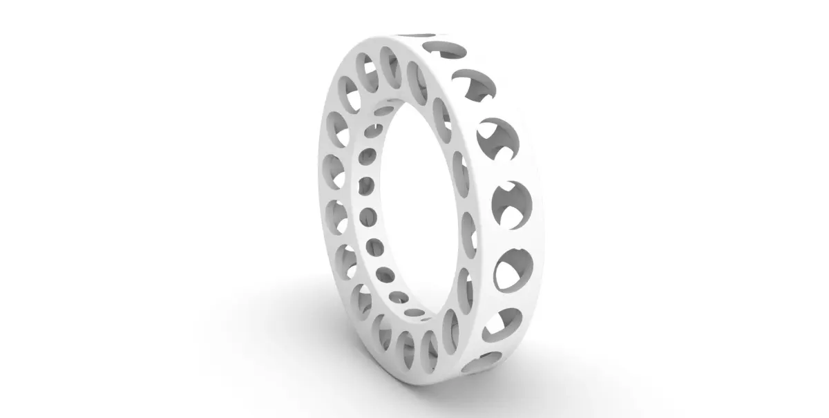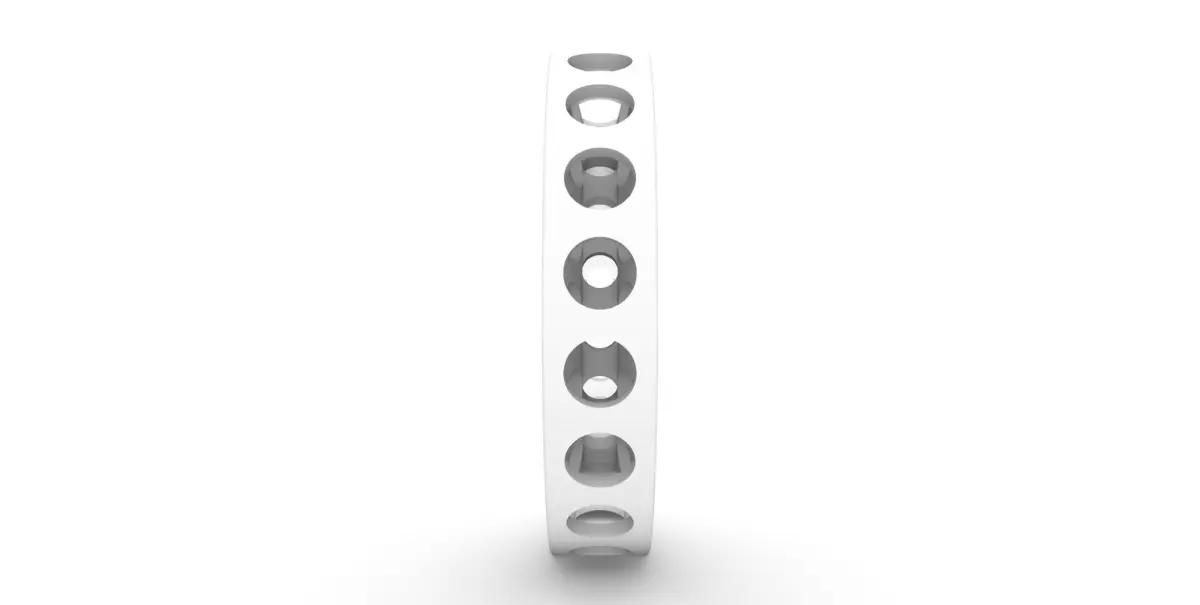 The ring has ring size 58 (circumference) is 5.5mm wide and 5mm high. The walls are 0.8mm thick. The holes have a diameter of 3.4mm outside and 1.8mm inside. The thinnest part of the bridges between the holes is 1mm. The volume of the ring is 502 cubic millimeters. You can scale the ring to fit your and your partners finger. Suitable for 3D printing (such as sls, sla, fdm) and wax casting. As a trained goldsmith with years of experience in 3D design, I work with great care. If something does not fit, please feel free to contact me.