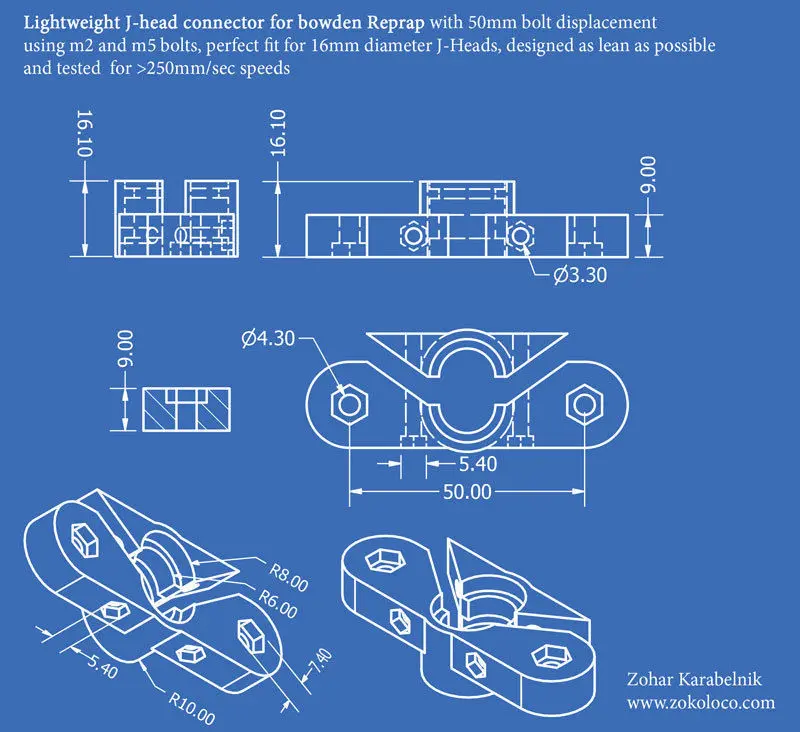 The major benefit of a bowden printer is having a very lightweight hotend that You can swing fast and free. I've designed this specific part for my reprap that can run over 250mm/sec and not lose a motor step. this part holds the 16mm J-Head firmly and keeps the nozzle exactly in place.make sure You measure Your J-head for an outer diameter of 16mm and inner of 12mm (see the blueprints).After upgrading my machine with this part the prints are smoother, more precise and also repeating precision has increaced.I'm adding the Inventor design file if You like to tweak the model.Printing recepie: I've printed the part in 0.25mm layers and if works fine, but for best results keep the print layer about 0.2mm.most of the torque is on the skin, I suggest a wall thickness and top/bottom thickness of at least 1mm.I've printed without an infill to keep the wight below 8 grams, You could add an infill but don't go over 15% or over 15 grams for best results.almost any material should do the job. I suggest PLA.If You have any questions keep in touch :)