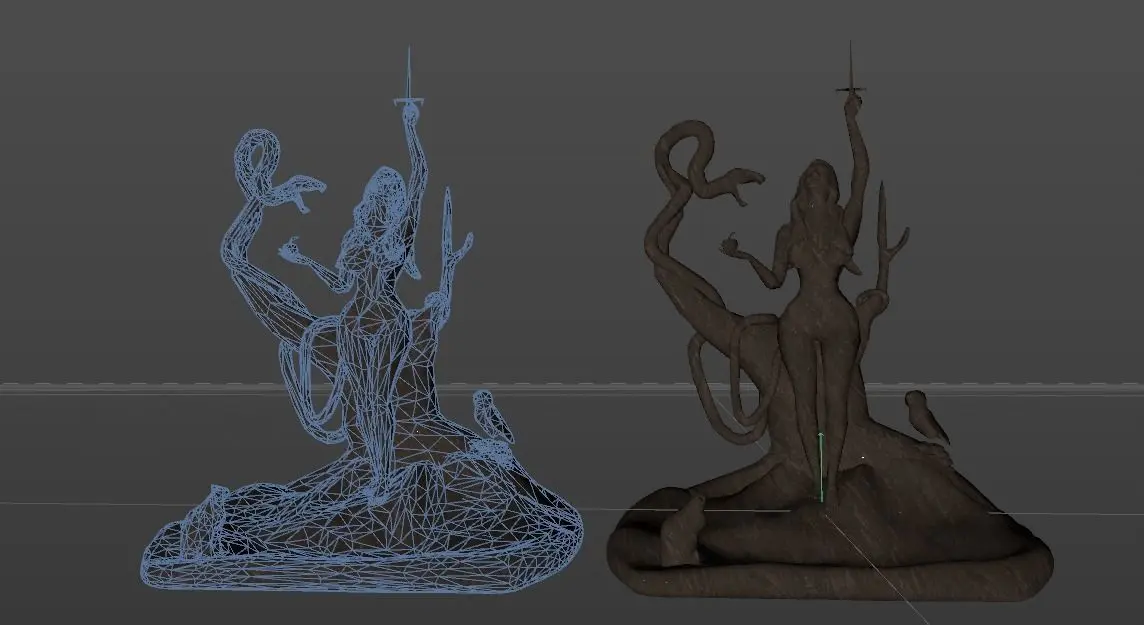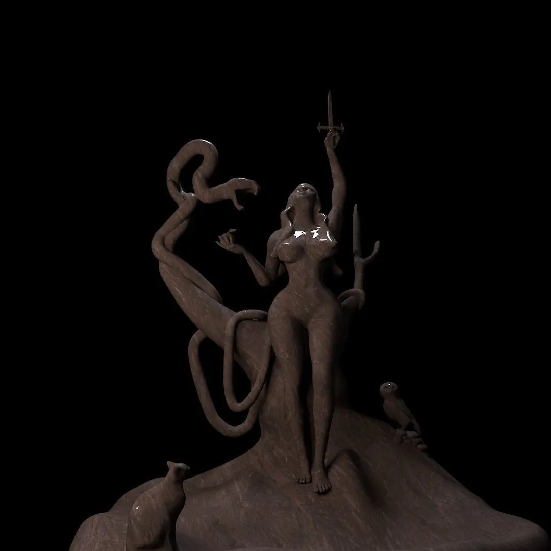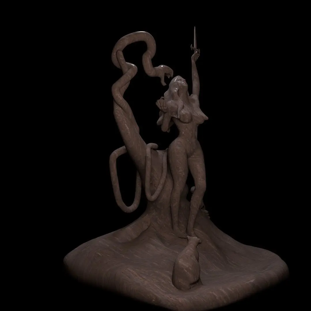 This captivating 3D model unveils the captivating presence of Lilith, poised beside a sinuous tree adorned with a serpent, holding a dagger aloft in one hand and a tempting apple in the other. Beneath her watchful gaze, a cat and an owl rest serenely upon the ground, adding to the mystical allure of the scene.
