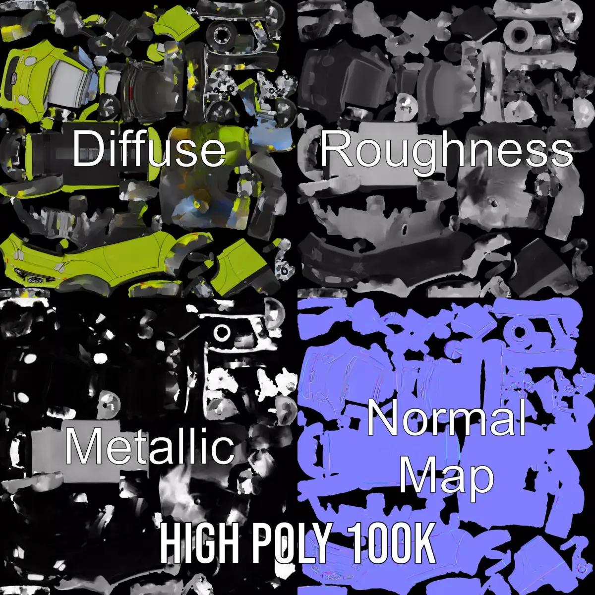 This vibrant lime green convertible model offers a stylish and modern vehicle design perfect for games, animations, and renderings. Each model has 3 levels of detail: low-poly (1000 triangles for mobile), middle-poly (10,000 triangles for environment), and high-poly (100,000 triangles), which allows for the use of this model in production rendering (such as 3ds Max, Maya, Cinema4D, Blender, Vray/Corona/Cycles, and all others), game engines (Unity and Unreal compatible), and interactive presentations, providing a choice of detail based on the LOD System principle. Ideal for urban scenes or car showcase projects. The model's textures are PBR, Diffuse, NormalMap, and reflection/roughness/metallic, which are suitable for any modern rendering engine. All models accurately unwrapped and have no overlapping UVs. Textures are 4096*4096 in size. Please like and leave a comment if you enjoyed the model.