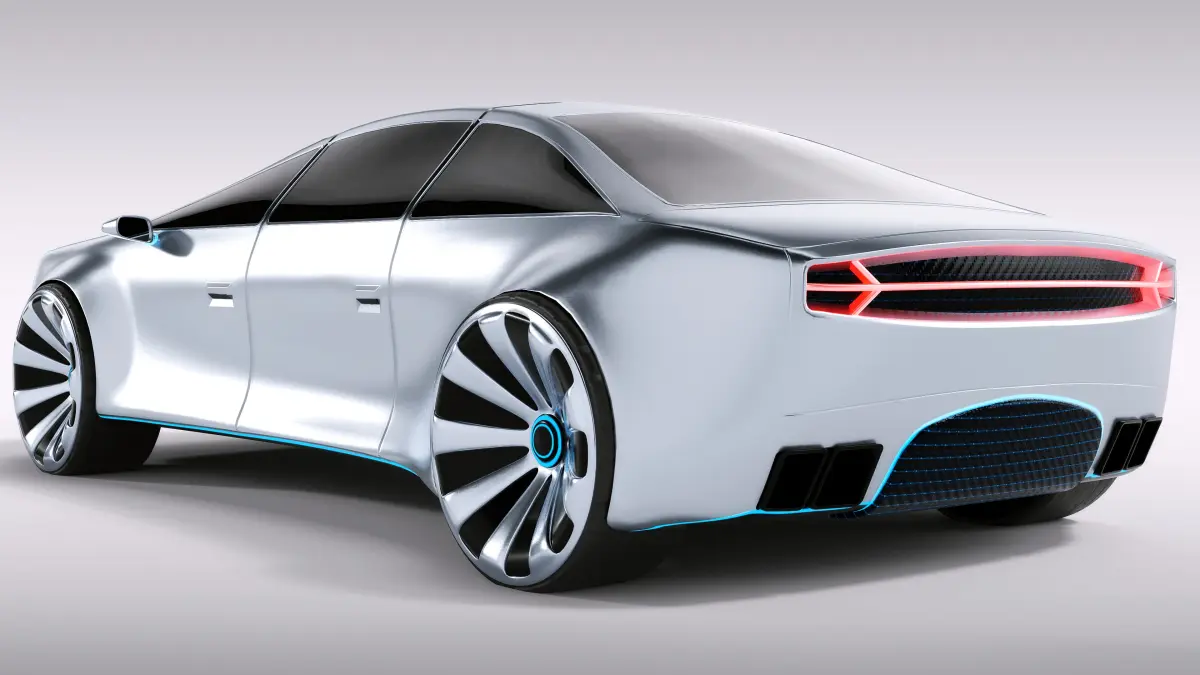 A futuristic limousine with a sleek, silver metallic body and neon blue accents, featuring gull-wing doors and tinted windows, gliding smoothly on the road with its levitating technology.