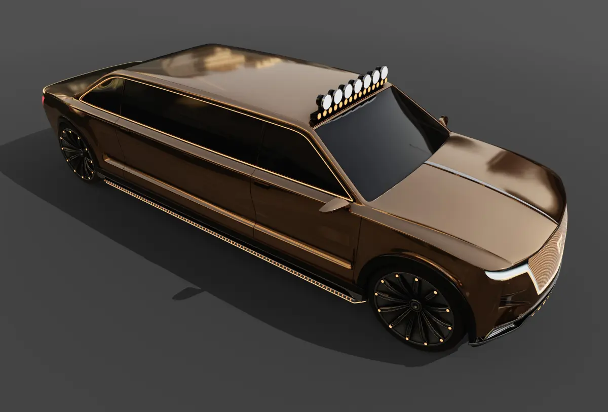 4 A modern champagne-colored limousine with LED lights and a futuristic design, making a statement on the road with its cutting-edge features and high-end appeal in the current timeline.