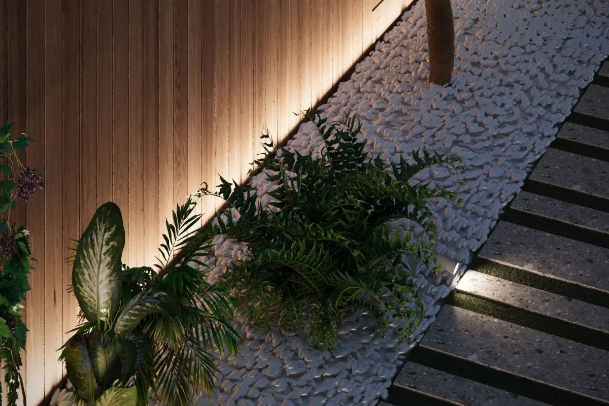 This 3D model depicts a linear backyard garden, with a linear garden path flanked by plants, a background tree, a pergola, and planters. The model is detailed and realistic, with high-quality textures and materials.
