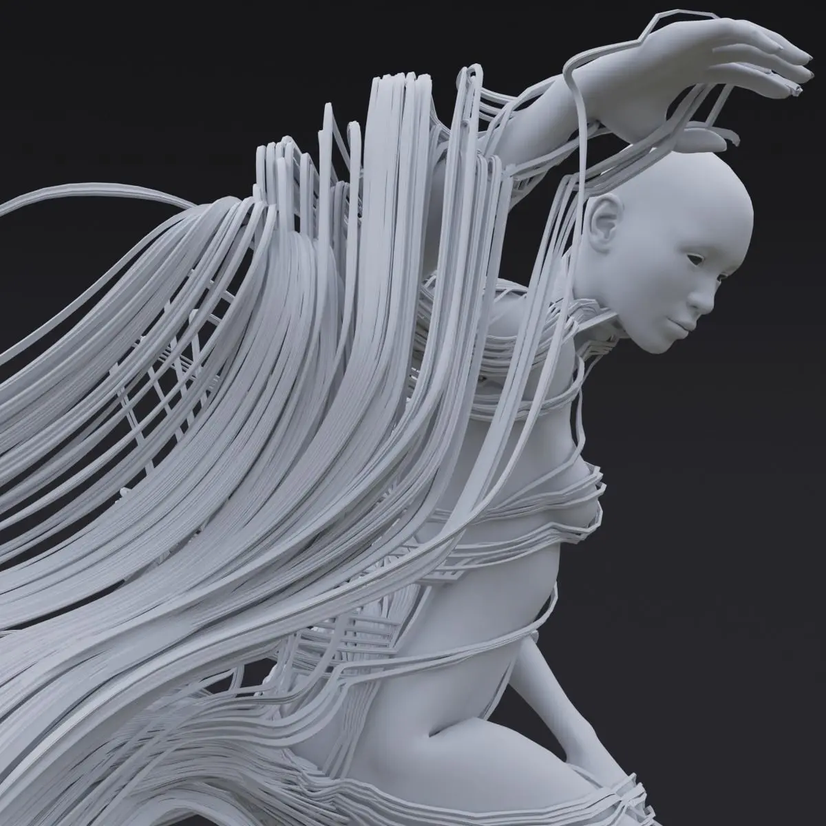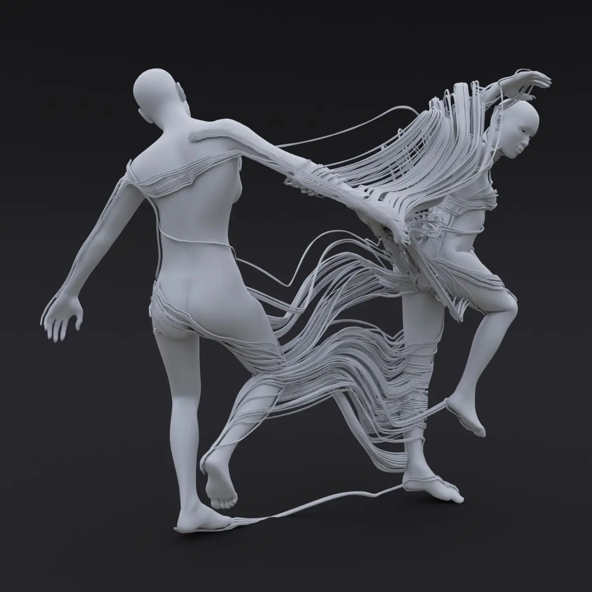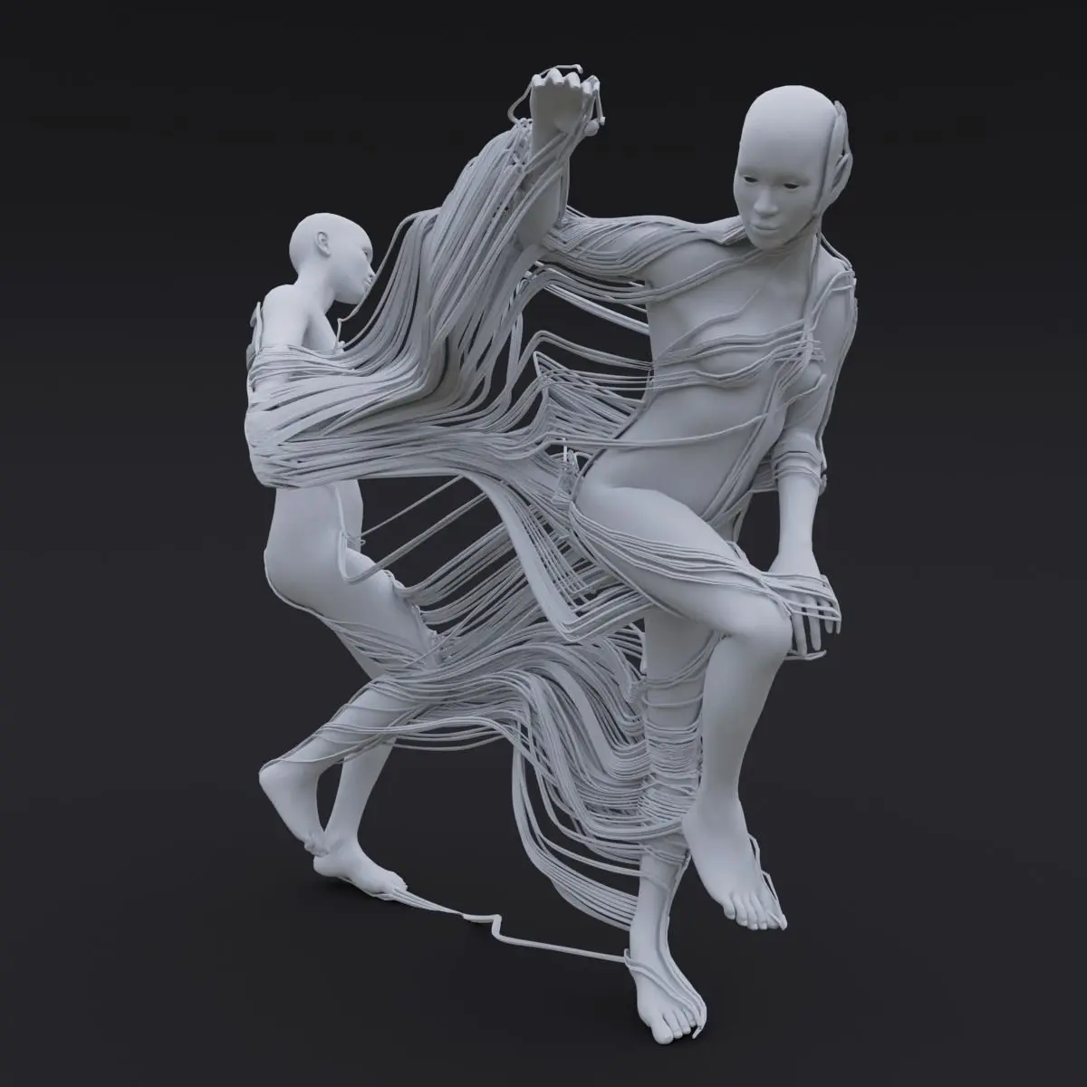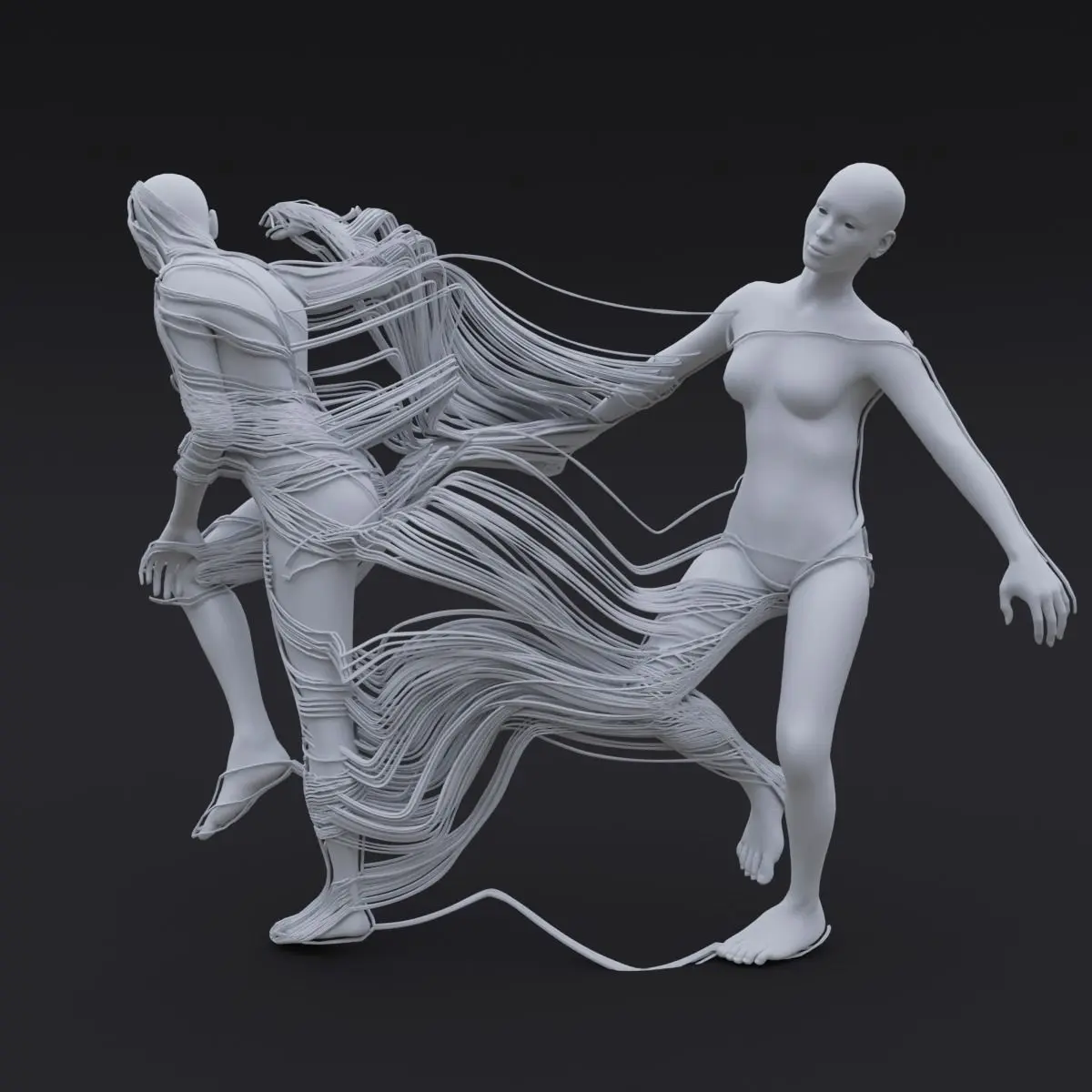 Wired tendrils pulling two figures together, sculpture created procedurally in HoudiniFX with Vex shader language.