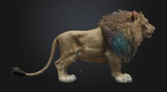 a 3D-rendered model of a lion standing in a neutral pose. The lion has a detailed mane with a mix of brown and subtle blueish hues, giving it a unique appearance. The fur texture and muscular build are well-defined, making the model look realistic.