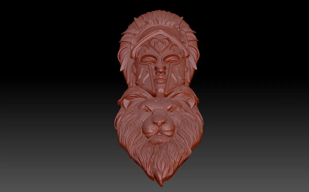 A 3D model of a bas-relief depicting a beautiful and expressive work - a girl and a lion. A warrior girl in a helmet, a lion as a symbol of strength and courage. The work is suitable for 3D printing and CNC machine tools.