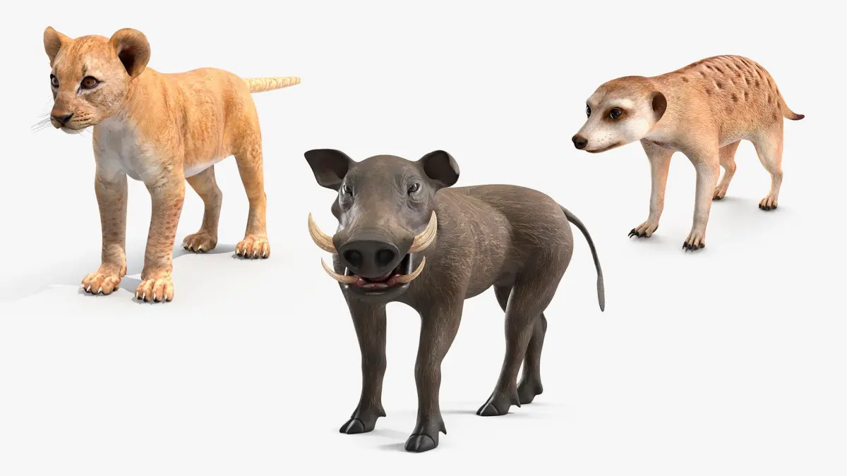 This model features realistic textures and details for each animal. The meerkat stands alert with a curious expression, the lion cub displays its playful nature, and the warthog is posed with its signature tusks and rugged appearance. Each animal showcases fine detailing suitable for various creative applications.