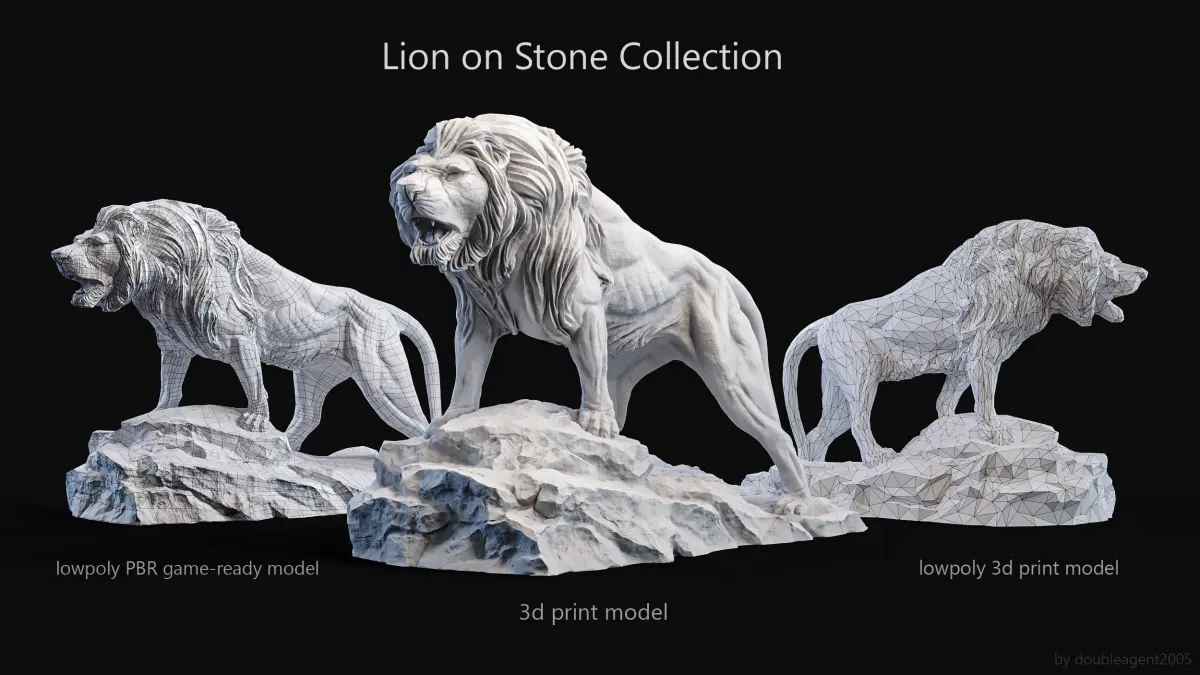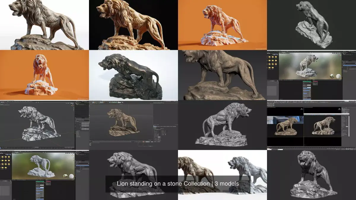 Lion standing on a stone Collection. 3 Models: 3d print model, lowpoly 3d print model, Lowpoly PBR model.