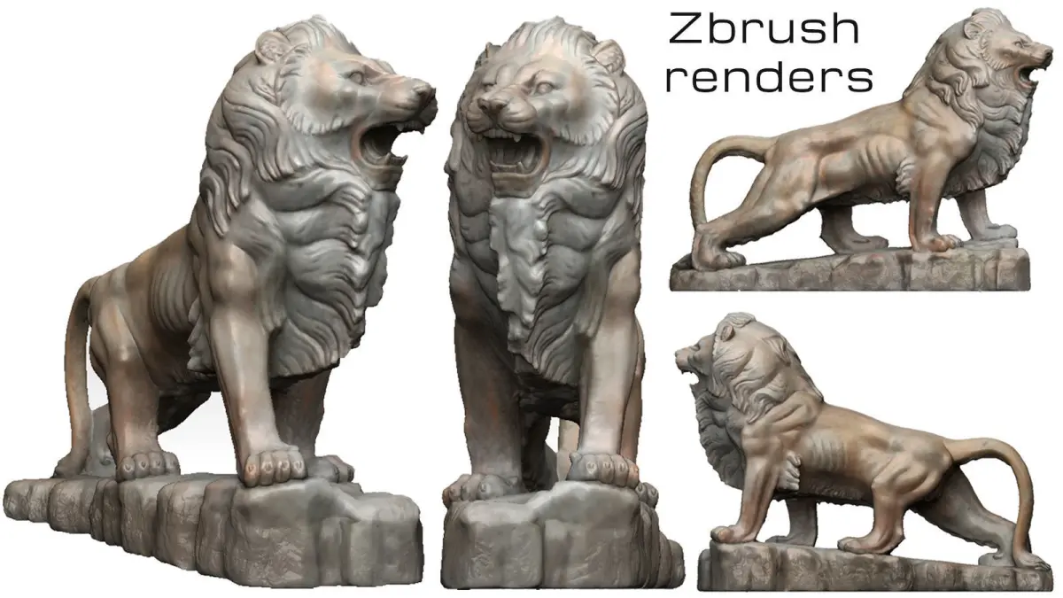 Model of a growling lion statue.The model is unwrapped and has 2k jpeg Diffuse, Normal and Glossiness maps.The model made in real-world size about 1.6 m high
