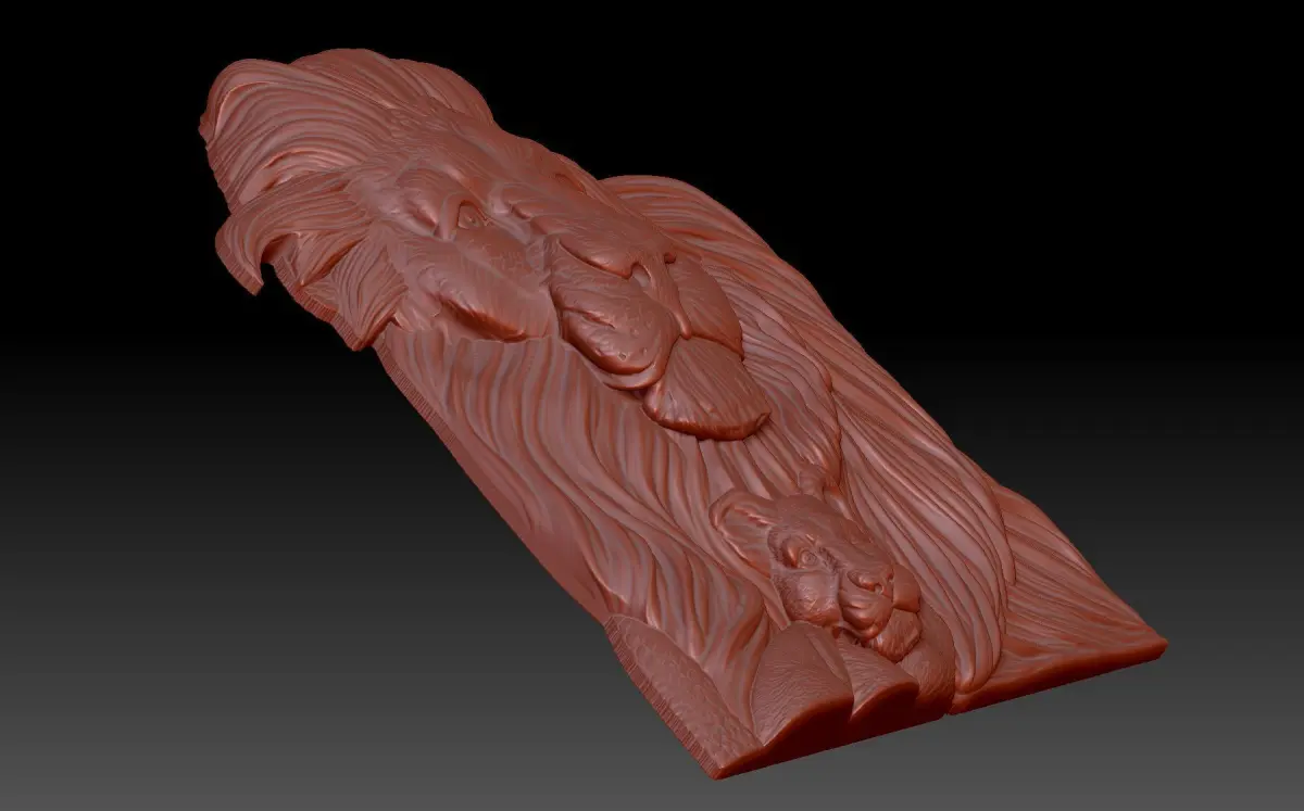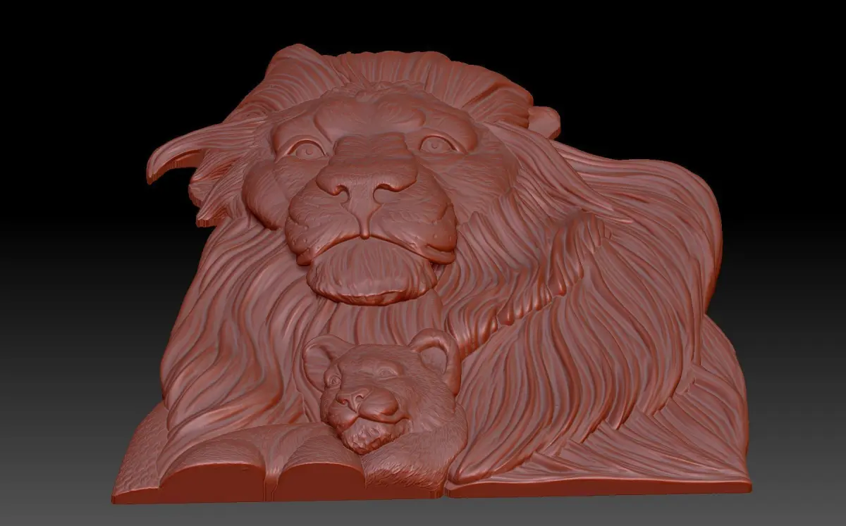 A 3D model of a bas-relief depicting a lion and a lion cub. A beautiful work depicting the king of all beasts with his child. The work is suitable for 3D printing and CNC machine tools.
