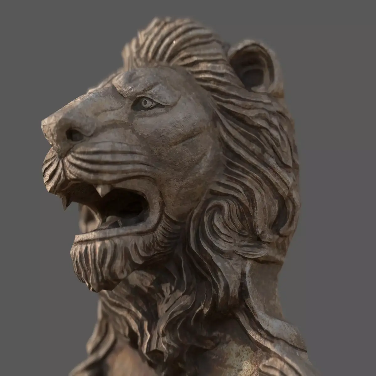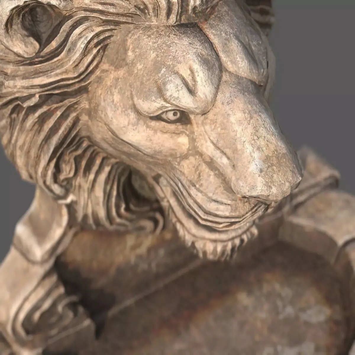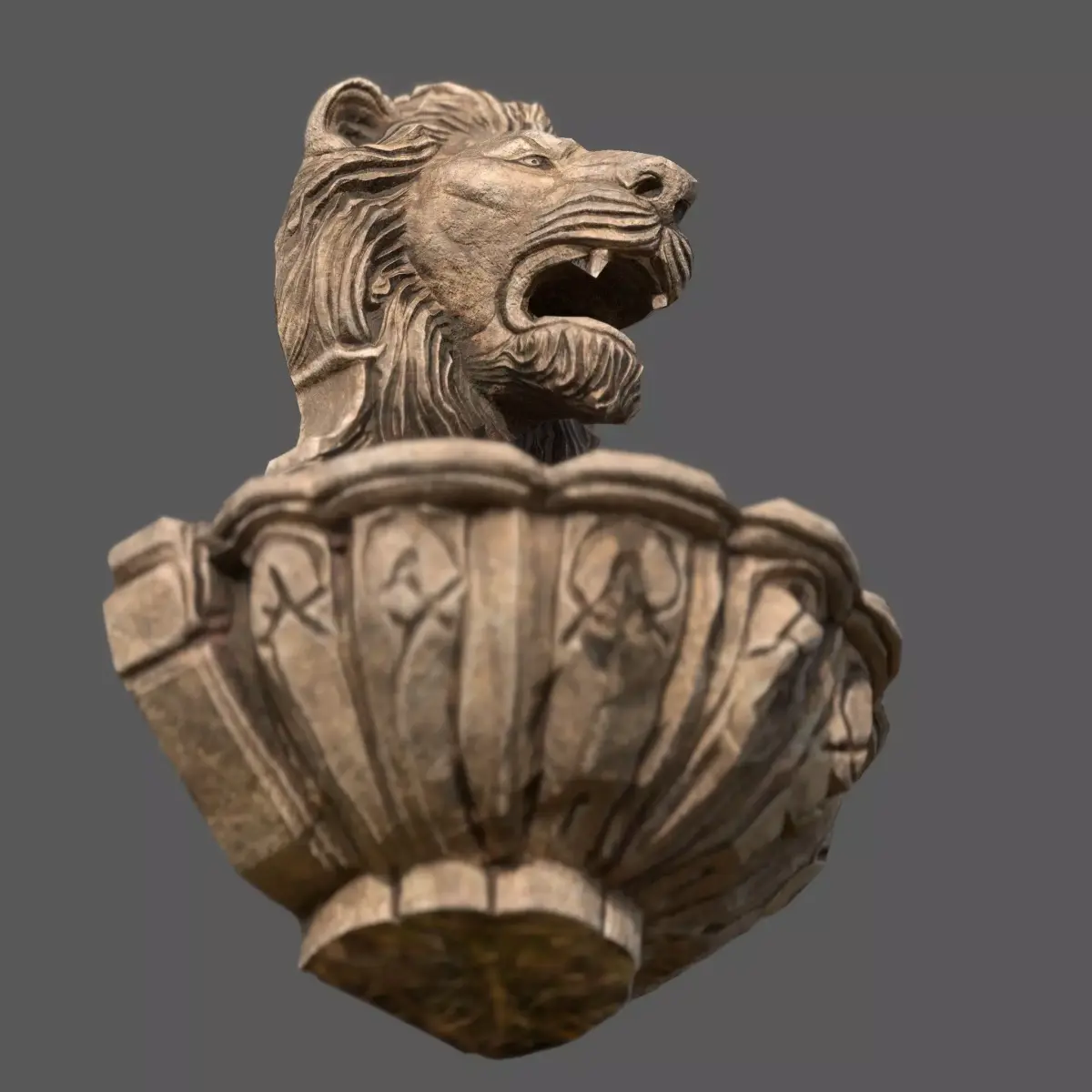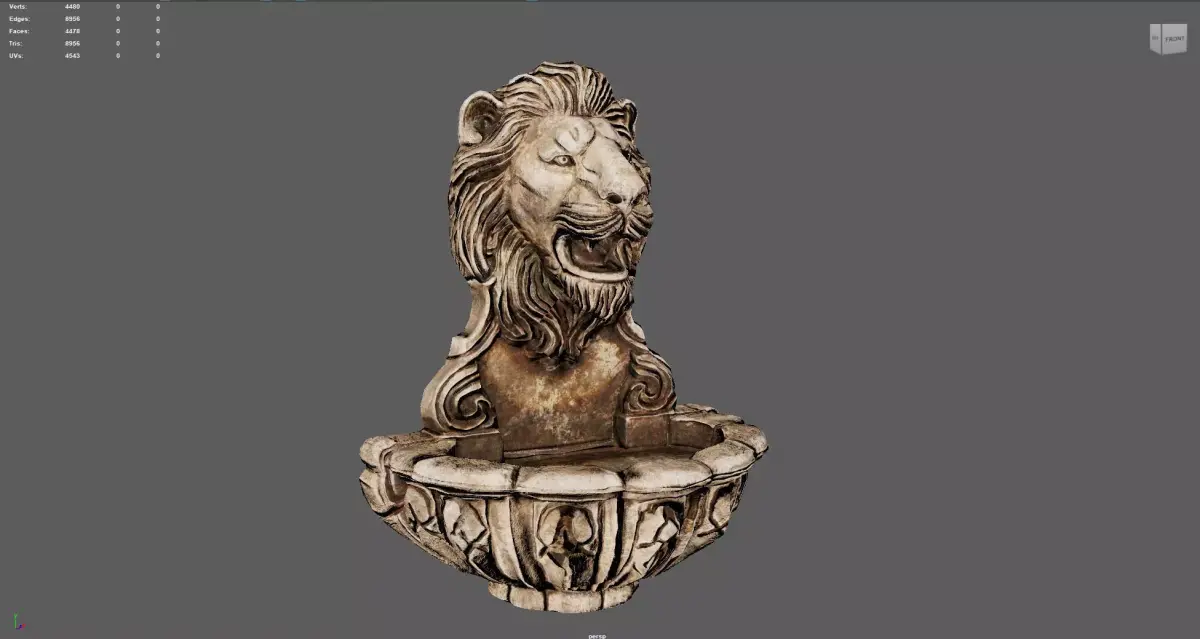 Lions Fountain Majesty is a highly detailed 3D model of a classic stone wall fountain featuring a majestic lion head sculpture.