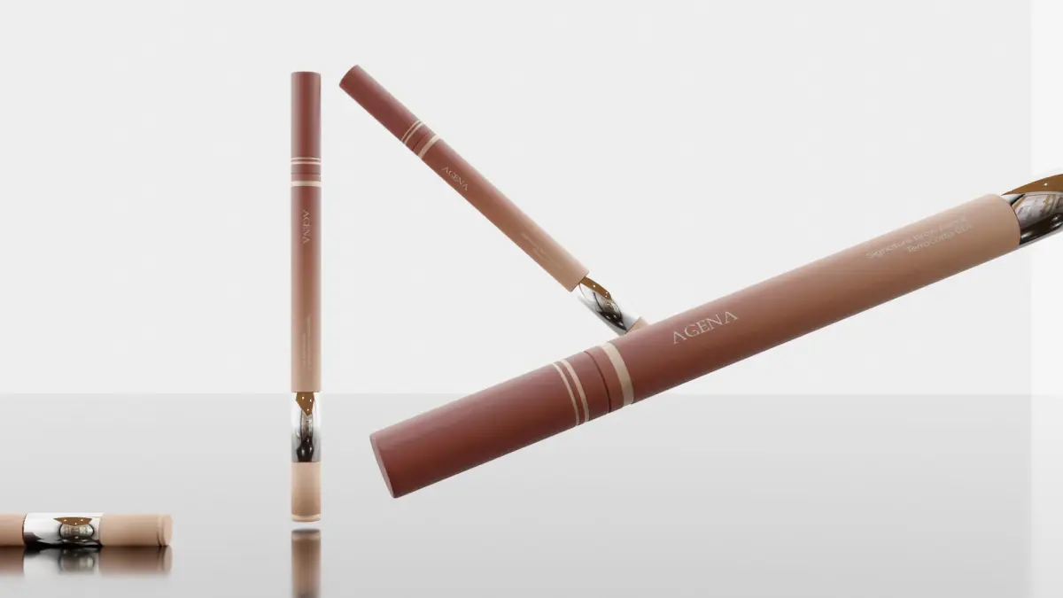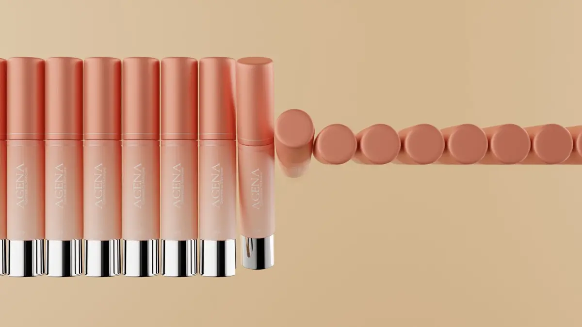 3D models of cosmetic packaging: lip gloss tubes, lipstick sticks, skincare sticks, and boxes.