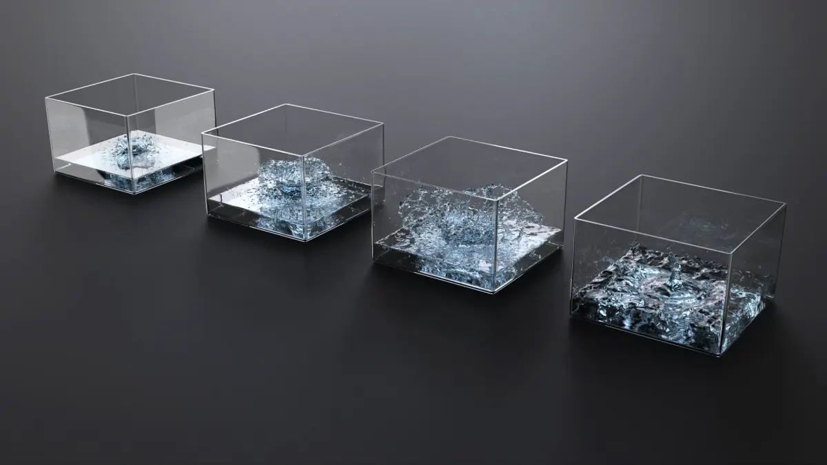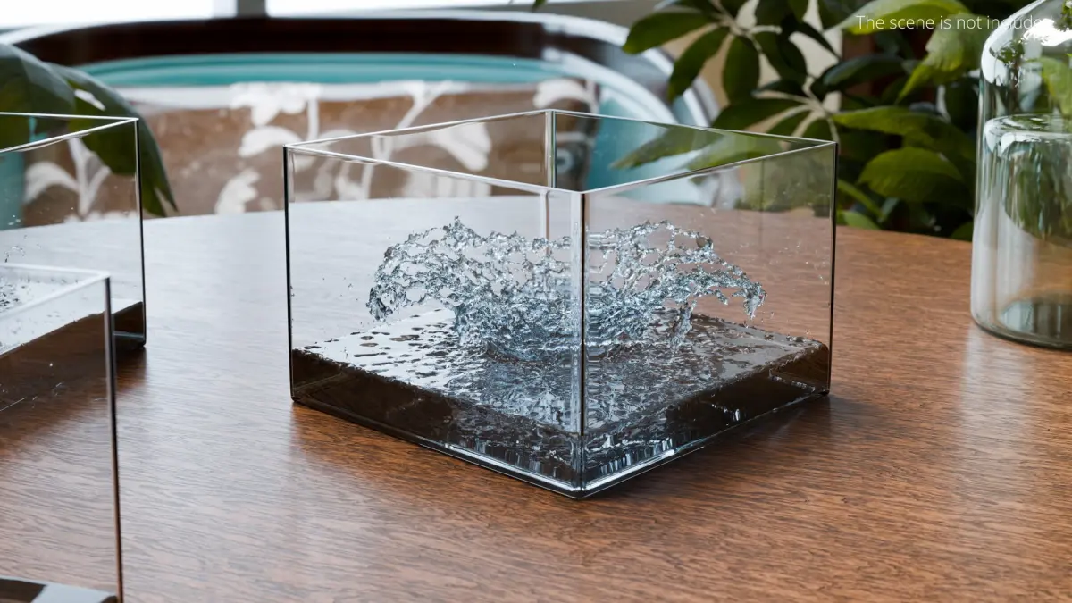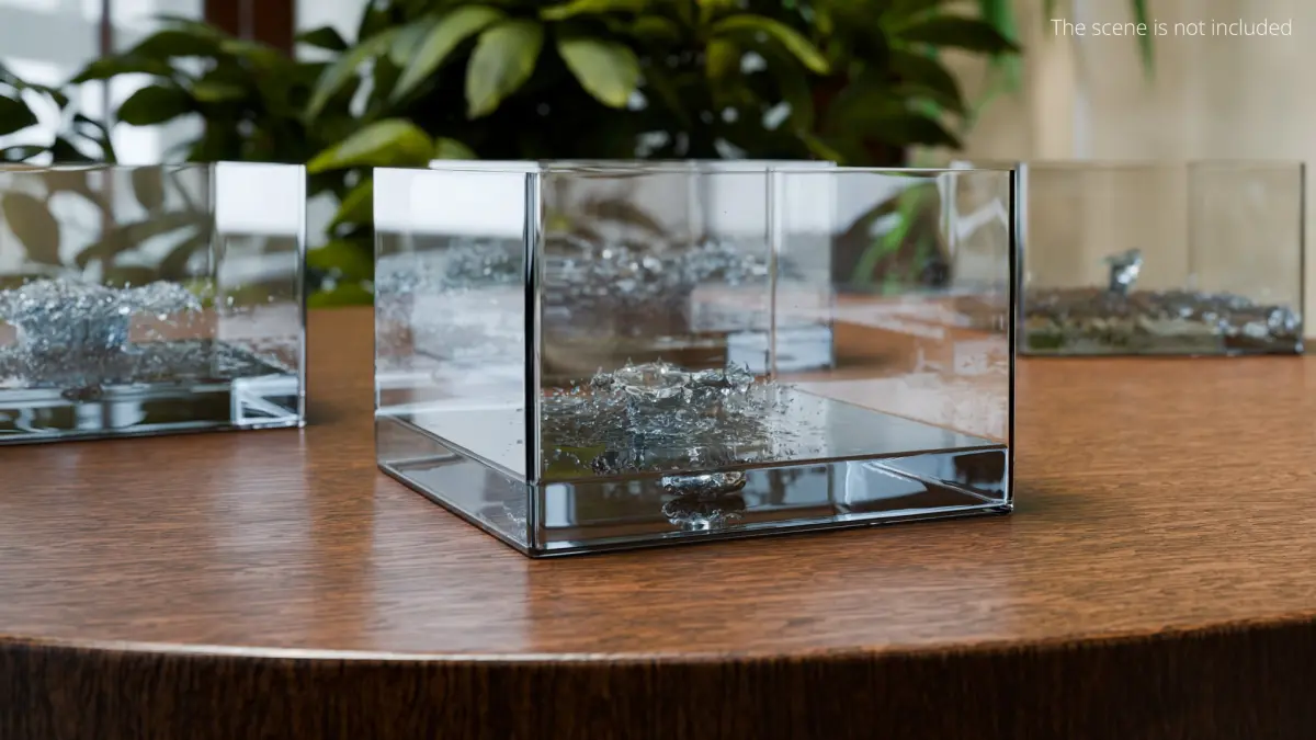 Set of glass cubes showcase intricate water splashes, creating the illusion of movement and activity. The transparent, polished surfaces of the cubes highlight the clarity and realism of the water, designed to mimic natural fluid dynamics.