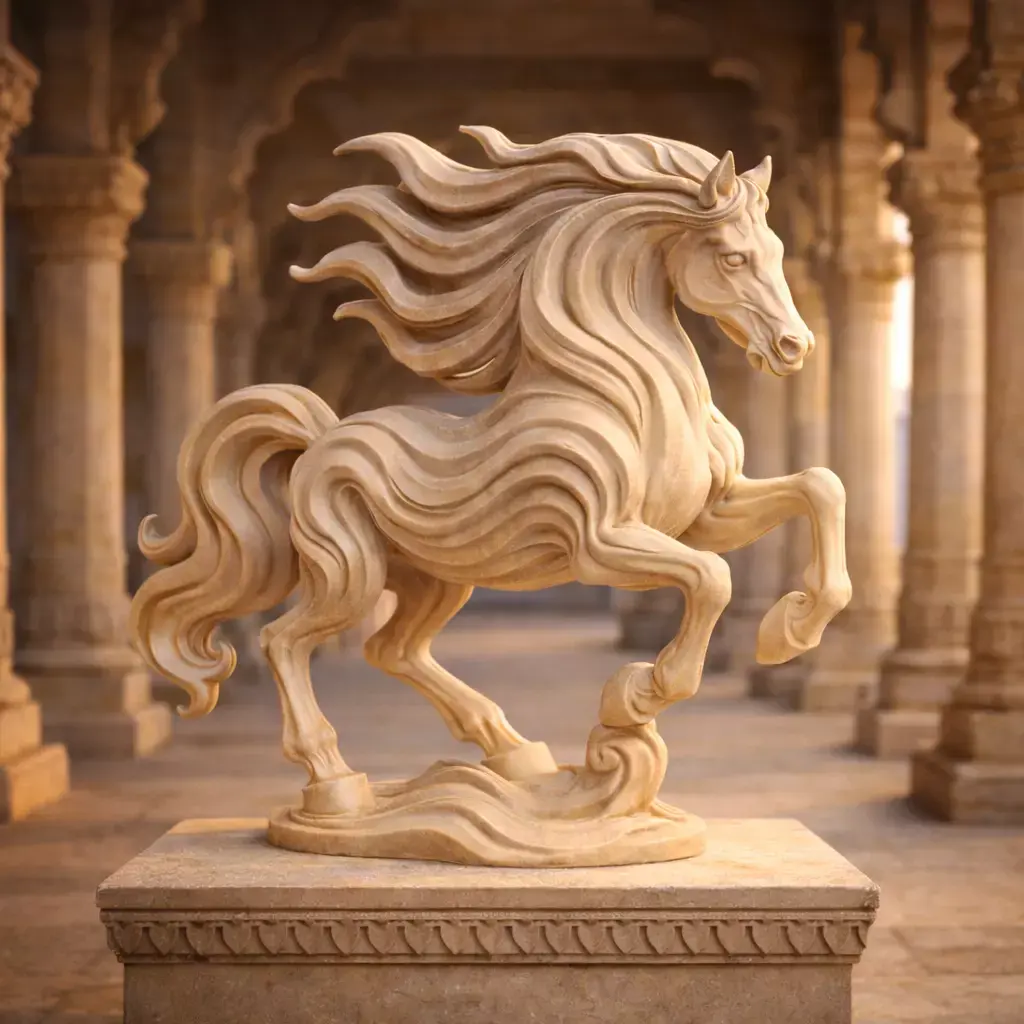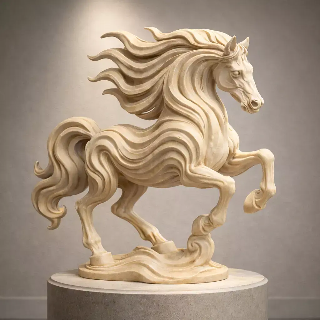 - LithoMane Horse – Stone Flow Sculpture- Abstract CNC & Architectural Sculpture Model- Description- LithoMane Horse is a premium abstract horse sculpture inspired by the natural flow of stone strata and organic motion. The design features smooth, layered curves that create a powerful sense of movement, strength, and elegance—making it ideal for CNC stone carving, architectural décor, luxury interiors, and gallery-style installations.- The flowing mane and sculpted body are optimized to highlight depth and shadow in stone materials such as antique limestone, marble, sandstone, soapstone, and metal finishes, ensuring excellent visual results in both real-world fabrication and high-end renders.- This model is designed with clean geometry and balanced proportions, suitable for heritage projects, palace courtyards, museum displays, modern art spaces, and premium exterior or interior décor.- Recommended Materials (Render & Fabrication)