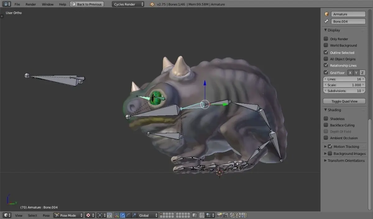 This is a little alien creature called Bob, that I modeled in blender. He's rigged and ready for animation or posing, with an easy-to-use armature, and a walk cycle. The material uses realistic shaders and textures in cycles render that can be used for semi-realistic or cartoon renders. The mesh has enough vertices for fine detail, but not enough to slow down the computer. This model can be posed and 3D printed also, and used as a decoration or toy.