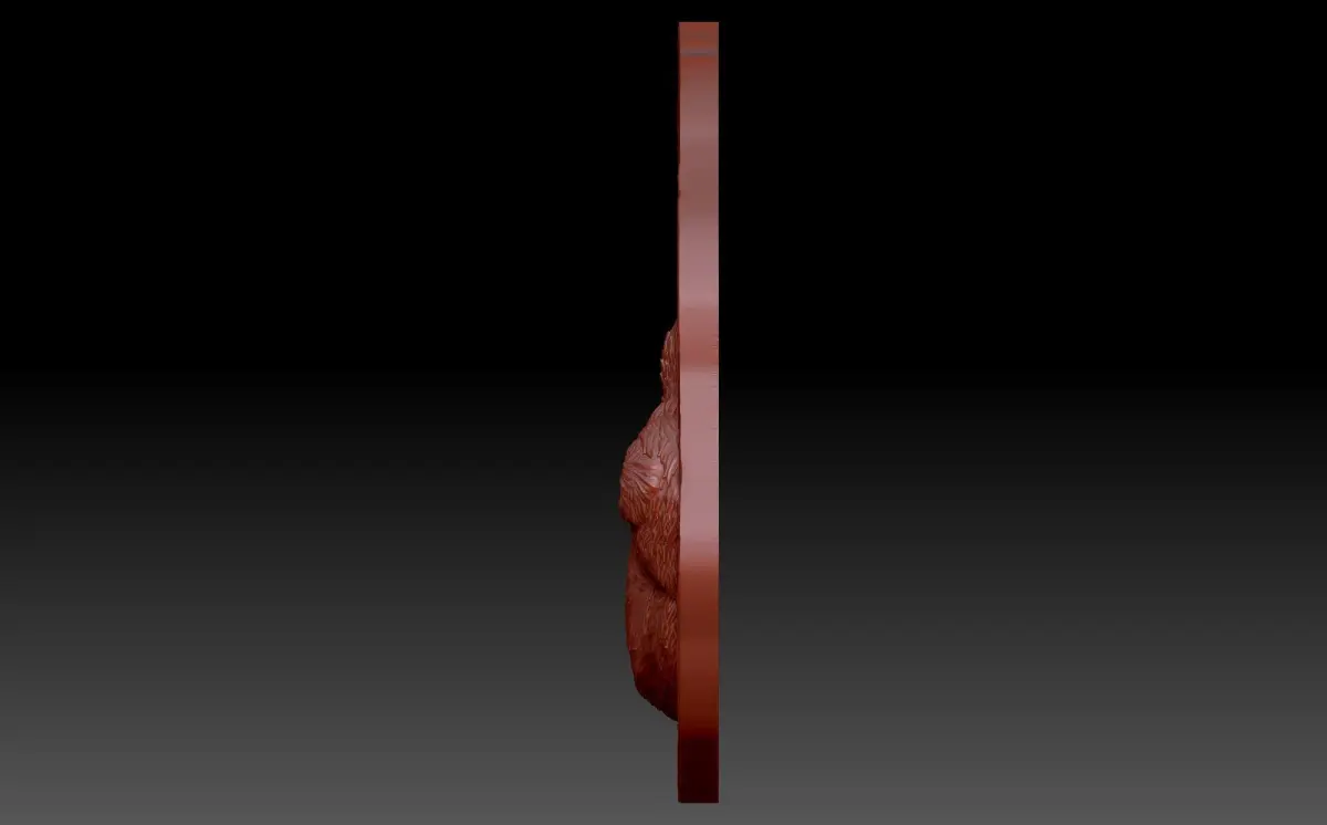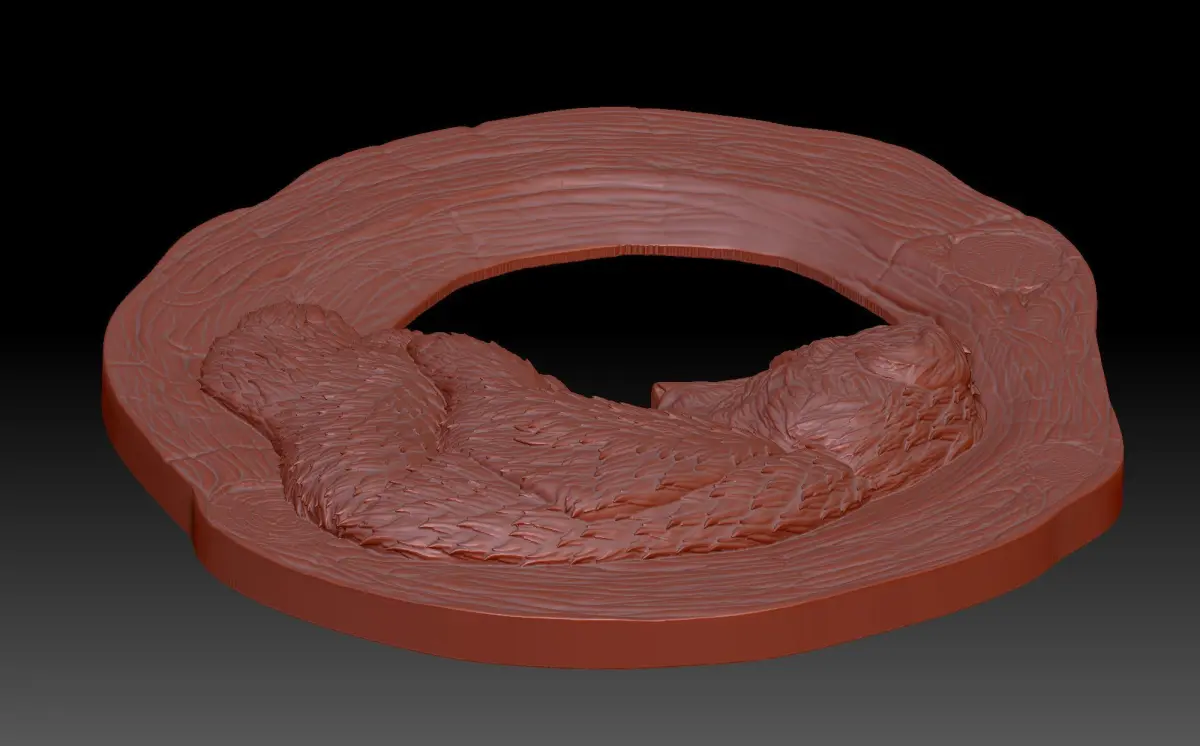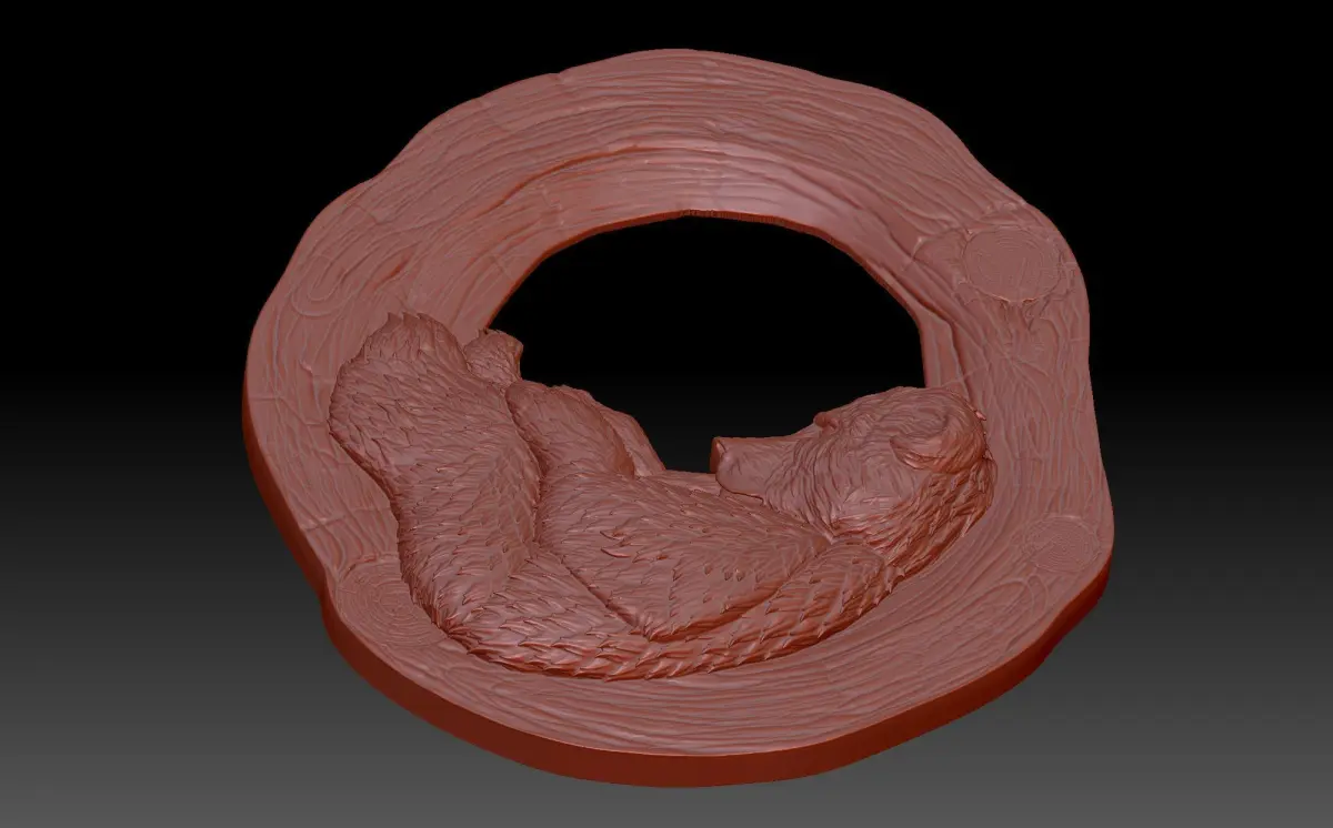 A 3D model of a bas-relief depicting a small bear cub. which lies in a hollow tree. A beautiful and light composition with a cute animal. The work is suitable for 3D printing and CNC machine tools.