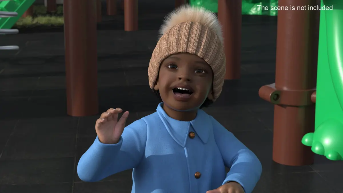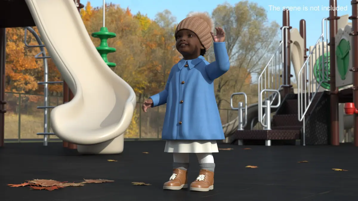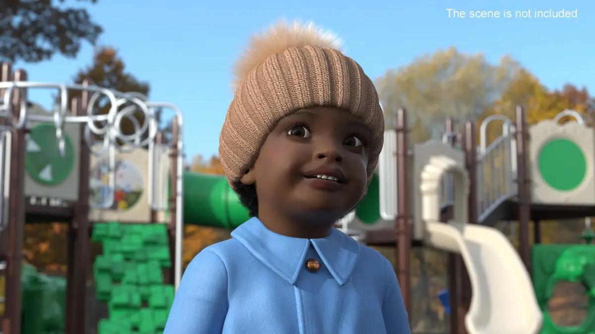 Little Black Girl Light Skin Autumn Clothes Fur Rigged is a three-dimensional model of Afro-American little girl (little one, female kid or toddler girl) who is a female child in the early stages of life.