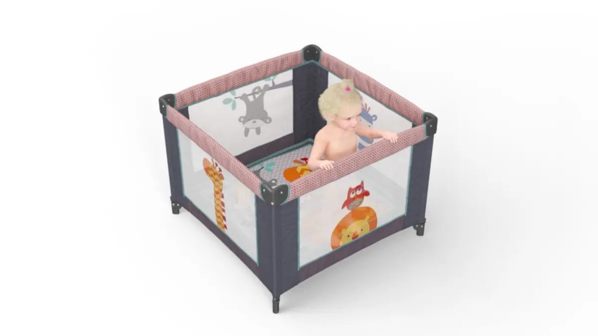Little Girl in Textile Playpen is a three-dimensional model of girl who is a human baby (little girl) kid, and who is a baby girl (human infant or female child in the early stages of life).