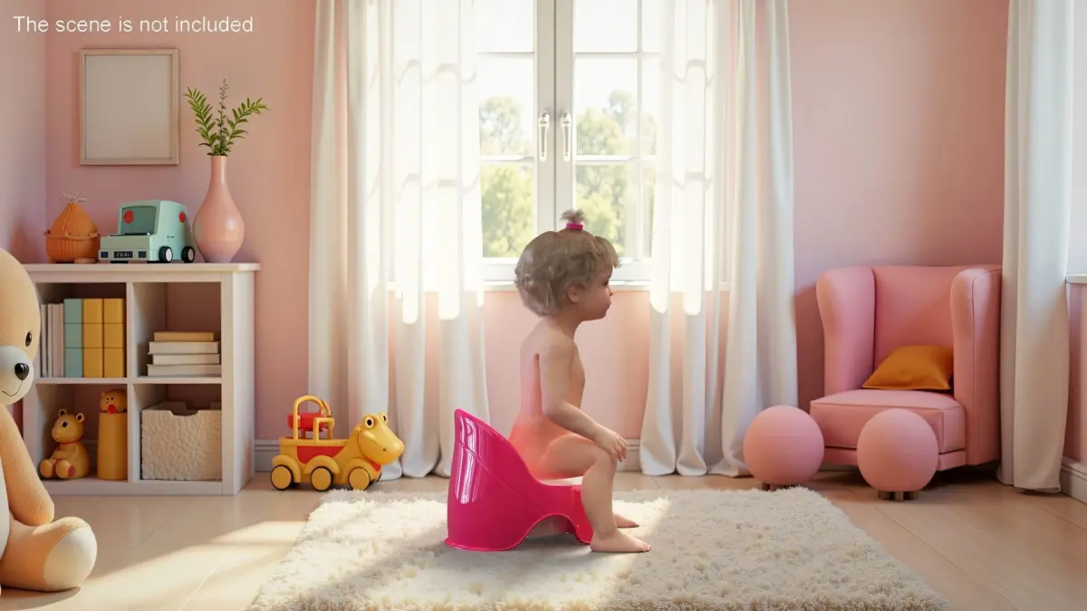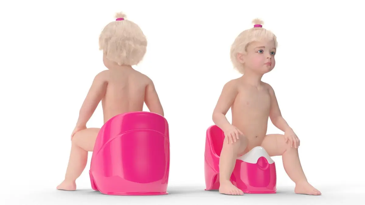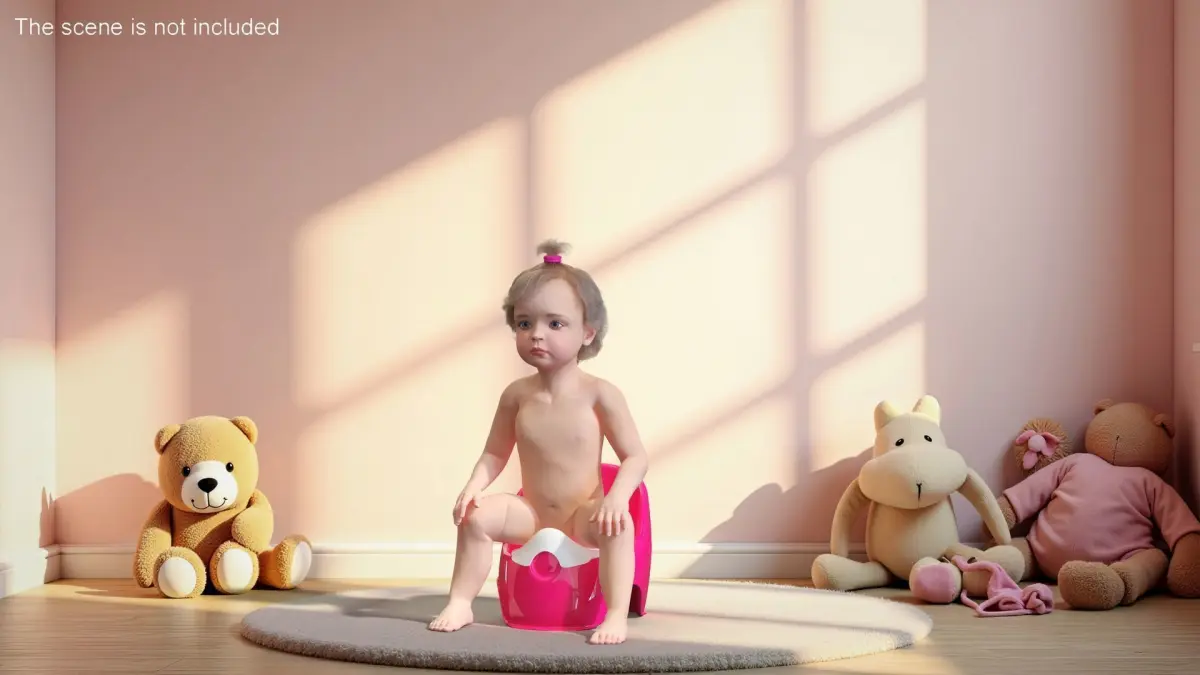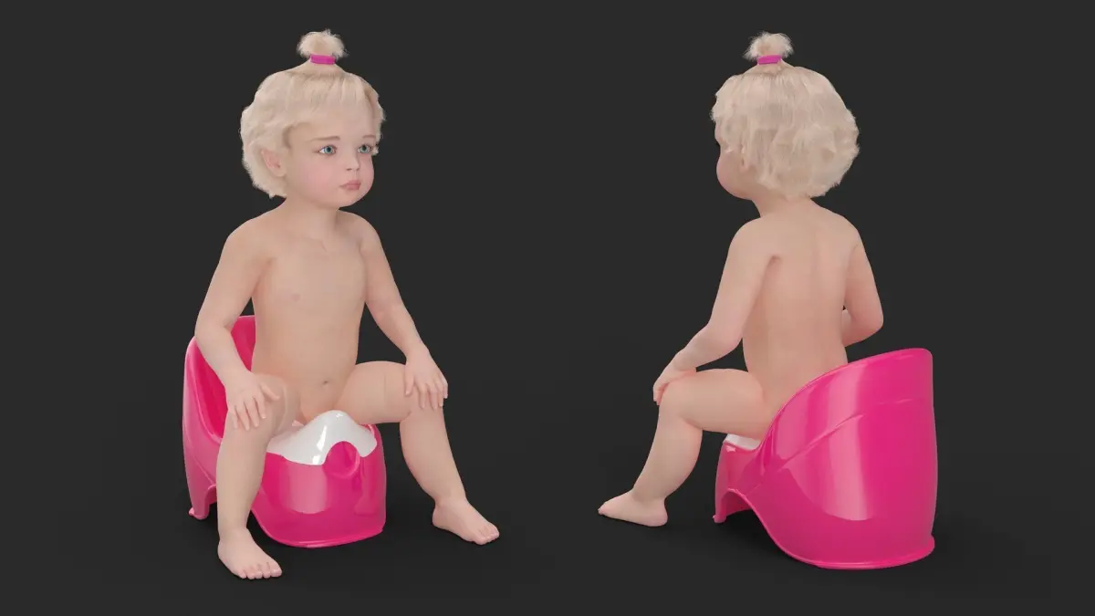 Little Girl on Potty Fur is a three-dimensional model of female toddler character who is a human female baby (female little one or small female kid), and who is a human infant girl in the early stage of life.