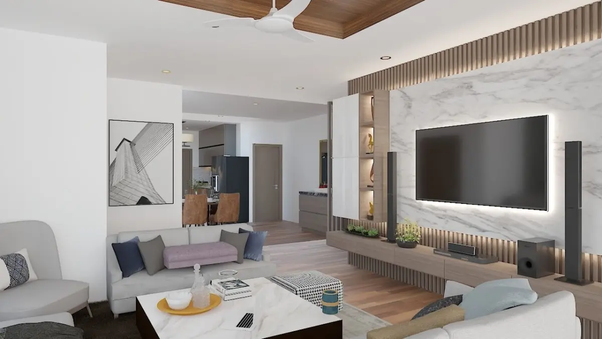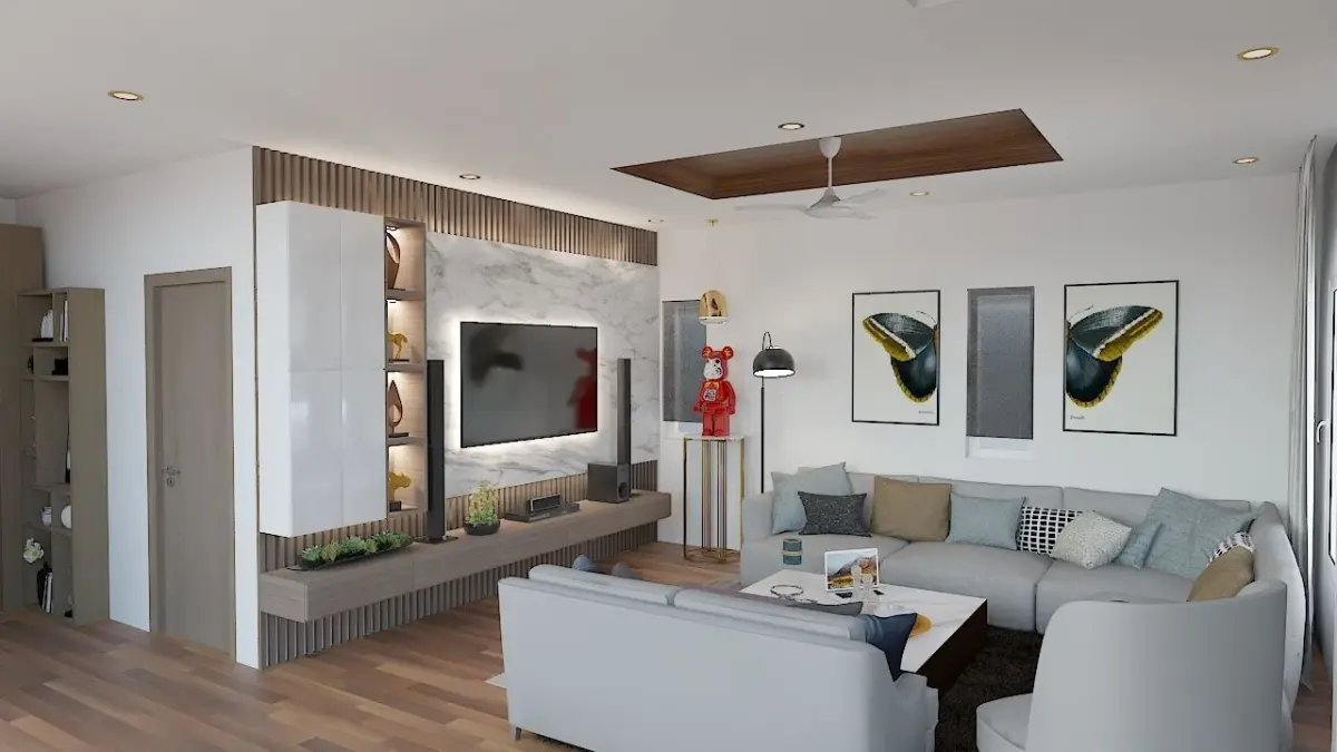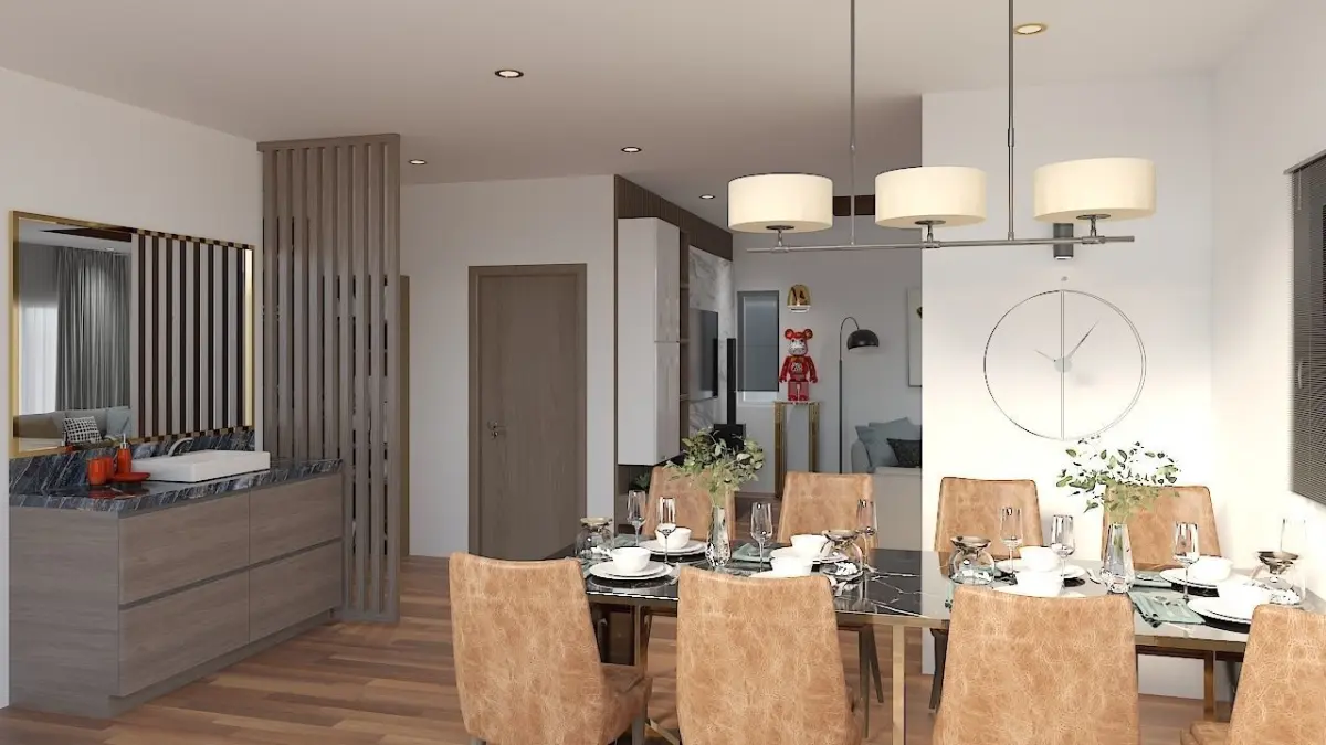 A fantastic combination of modern, minimalist, elegant, contemporary, and bright interiors. The living and dining areas are finished with premium materials from start to finish, including the flooring, ceiling, material finishes, and paint. Every home deserves a premium living and dining area. Because the living room and dining room are two of the most frequently utilised areas of the house, everyone deserves a well-equipped living room. This is a living and dining area with a variety of places including full-fledged seats, a huge view window, an 8-seat dining table, a vanity for easy access even for visitors, and a fully equipped television unit. This Interiorspace features a wooden floor with a wooden ceiling articulation. #cgtp-4 #p-11