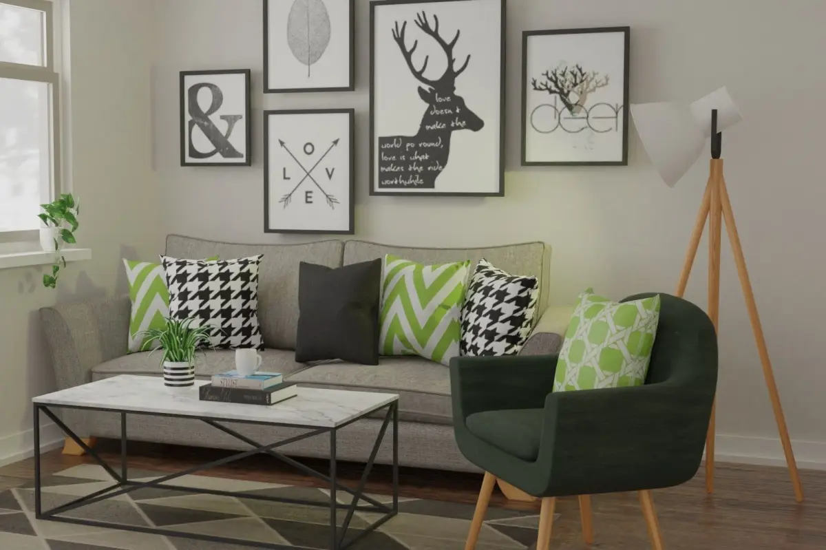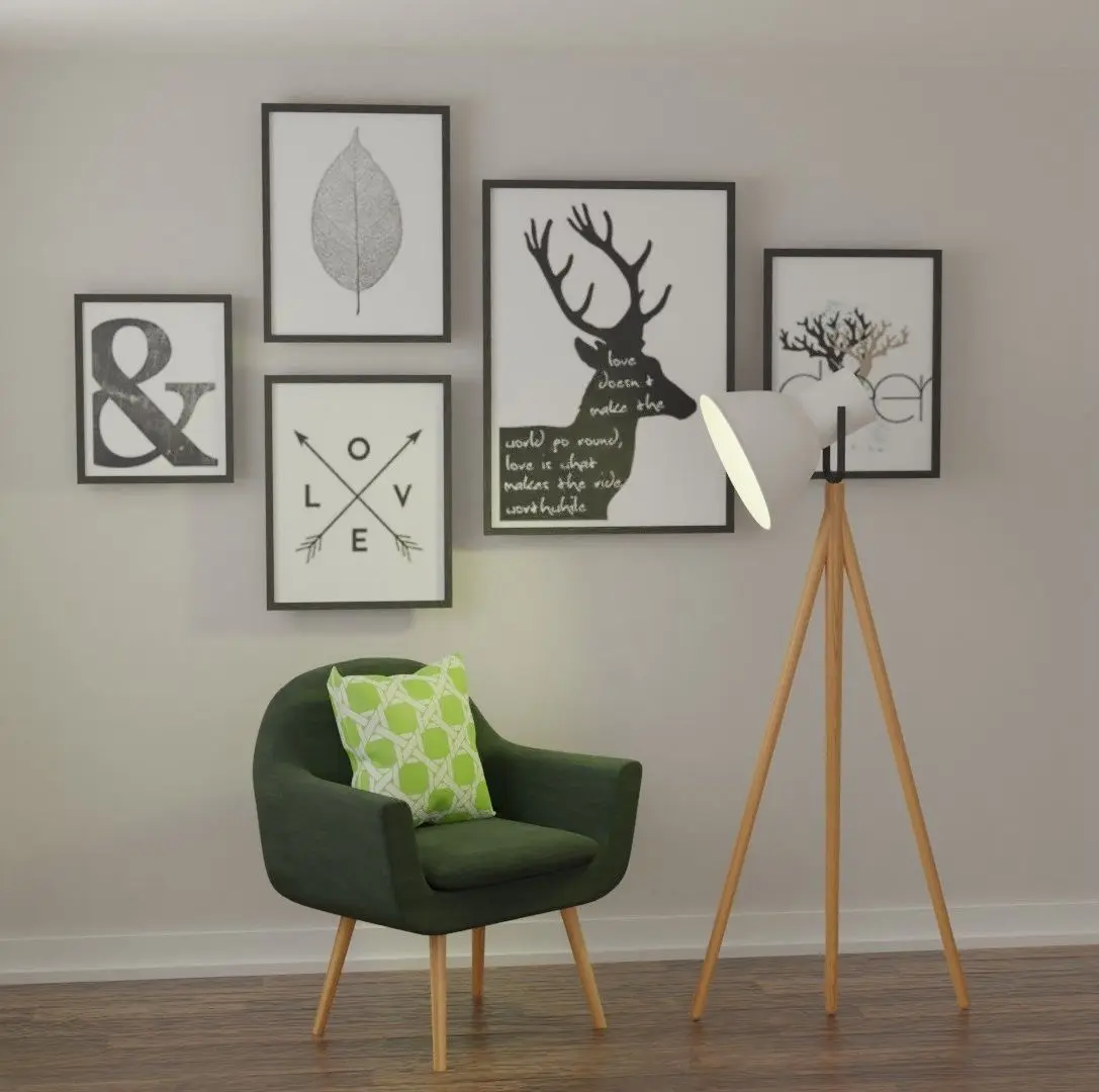 This is a high poly 3D model design for an interior scene in Scandinavian living area. Set of furniture pieces were based on standard dimension such as three seater sofa, single arm chair sofa, center table, area rug, Adna floor lamp, display pieces/accessories (plants in ceramic pots, books, mugs, pillows and wall frames). All models are in loose parts meaning object parts are not joined.