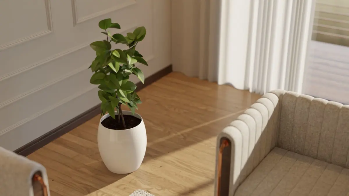 It has sofa set, Plant, table, carpet, Lights, Door, TV, Balcony, Wall Design, Painting, Lamp, Bean bag, wall showcase, wall, Designs, Celling Lights.